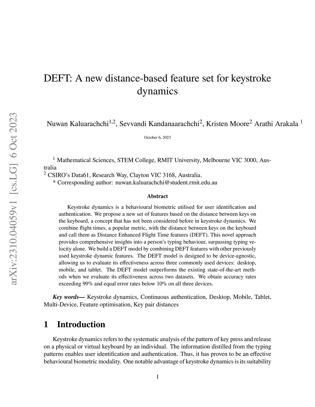 Keystroke dynamics is a behavioural biometric utilised for user identification and authentication. We propose a new set of features based on the distance between keys on the keyboard, a concept that has not been considered before in keystroke dynamics. We combine flight times, a popular metric, with the distance between keys on the keyboard and call them as Distance Enhanced Flight Time features (DEFT). This novel approach provides comprehensive insights into a person's typing behaviour, surpassing typing velocity alone. We build a DEFT model by combining DEFT features with other previously used keystroke dynamic features. The DEFT model is designed to be device-agnostic, allowing us to evaluate its effectiveness across three commonly used devices: desktop, mobile, and tablet. The DEFT model outperforms the existing state-of-the-art methods when we evaluate its effectiveness across two datasets. We obtain accuracy rates exceeding 99% and equal error rates below 10% on all three devices.