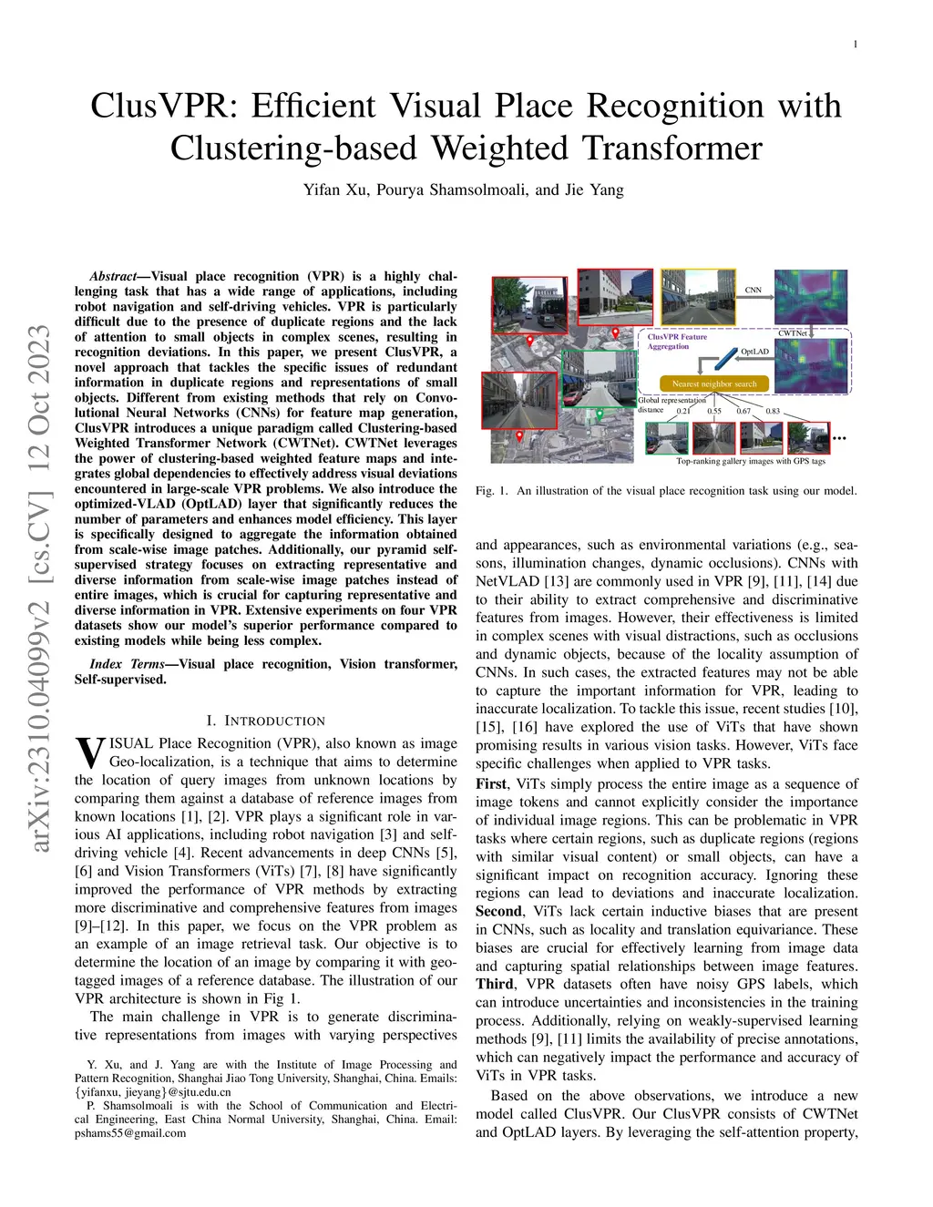 Visual place recognition (VPR) is a highly challenging task that has a wide range of applications, including robot navigation and self-driving vehicles. VPR is particularly difficult due to the presence of duplicate regions and the lack of attention to small objects in complex scenes, resulting in recognition deviations. In this paper, we present ClusVPR, a novel approach that tackles the specific issues of redundant information in duplicate regions and representations of small objects. Different from existing methods that rely on Convolutional Neural Networks (CNNs) for feature map generation, ClusVPR introduces a unique paradigm called Clustering-based Weighted Transformer Network (CWTNet). CWTNet leverages the power of clustering-based weighted feature maps and integrates global dependencies to effectively address visual deviations encountered in large-scale VPR problems. We also introduce the optimized-VLAD (OptLAD) layer that significantly reduces the number of parameters and enhances model efficiency. This layer is specifically designed to aggregate the information obtained from scale-wise image patches. Additionally, our pyramid self-supervised strategy focuses on extracting representative and diverse information from scale-wise image patches instead of entire images, which is crucial for capturing representative and diverse information in VPR. Extensive experiments on four VPR datasets show our model's superior performance compared to existing models while being less complex.