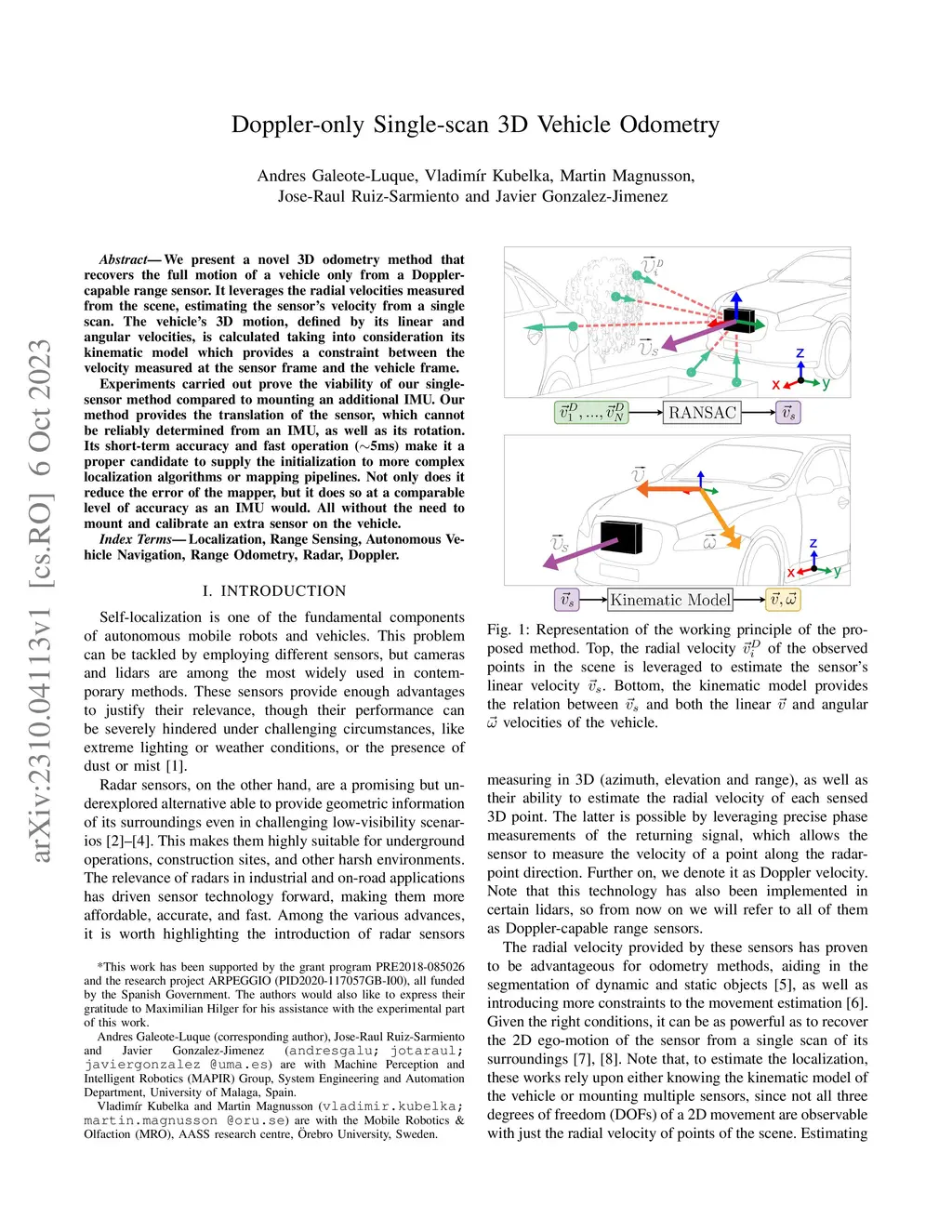 We present a novel 3D odometry method that recovers the full motion of a vehicle only from a Doppler-capable range sensor. It leverages the radial velocities measured from the scene, estimating the sensor's velocity from a single scan. The vehicle's 3D motion, defined by its linear and angular velocities, is calculated taking into consideration its kinematic model which provides a constraint between the velocity measured at the sensor frame and the vehicle frame. Experiments carried out prove the viability of our single-sensor method compared to mounting an additional IMU. Our method provides the translation of the sensor, which cannot be reliably determined from an IMU, as well as its rotation. Its short-term accuracy and fast operation (~5ms) make it a proper candidate to supply the initialization to more complex localization algorithms or mapping pipelines. Not only does it reduce the error of the mapper, but it does so at a comparable level of accuracy as an IMU would. All without the need to mount and calibrate an extra sensor on the vehicle.