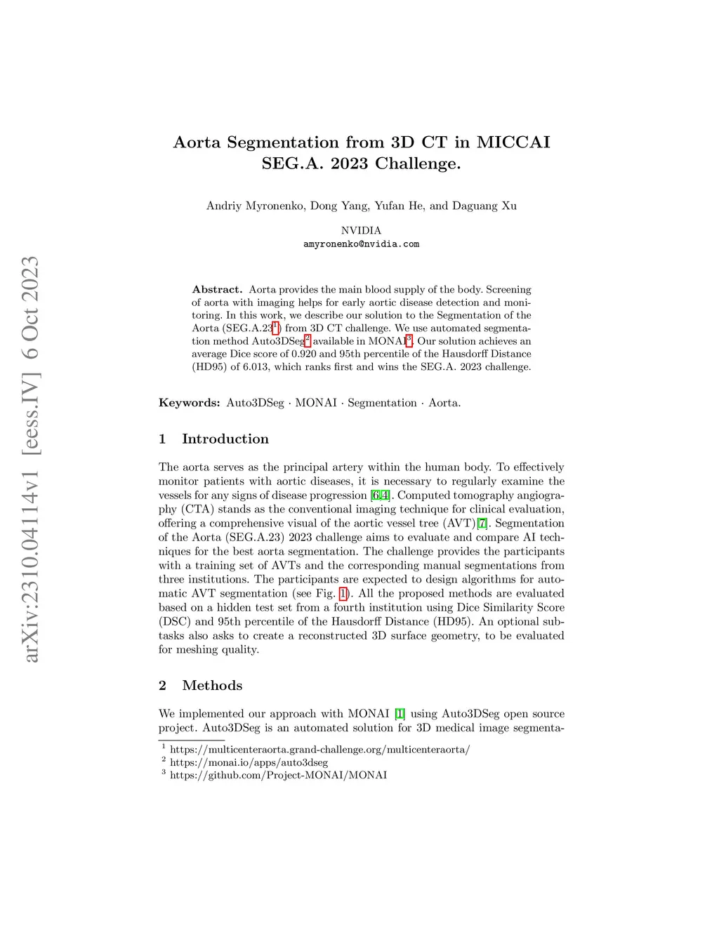 Aorta provides the main blood supply of the body. Screening of aorta with imaging helps for early aortic disease detection and monitoring. In this work, we describe our solution to the Segmentation of the Aorta (SEG.A.231) from 3D CT challenge. We use automated segmentation method Auto3DSeg available in MONAI. Our solution achieves an average Dice score of 0.920 and 95th percentile of the Hausdorff Distance (HD95) of 6.013, which ranks first and wins the SEG.A. 2023 challenge.