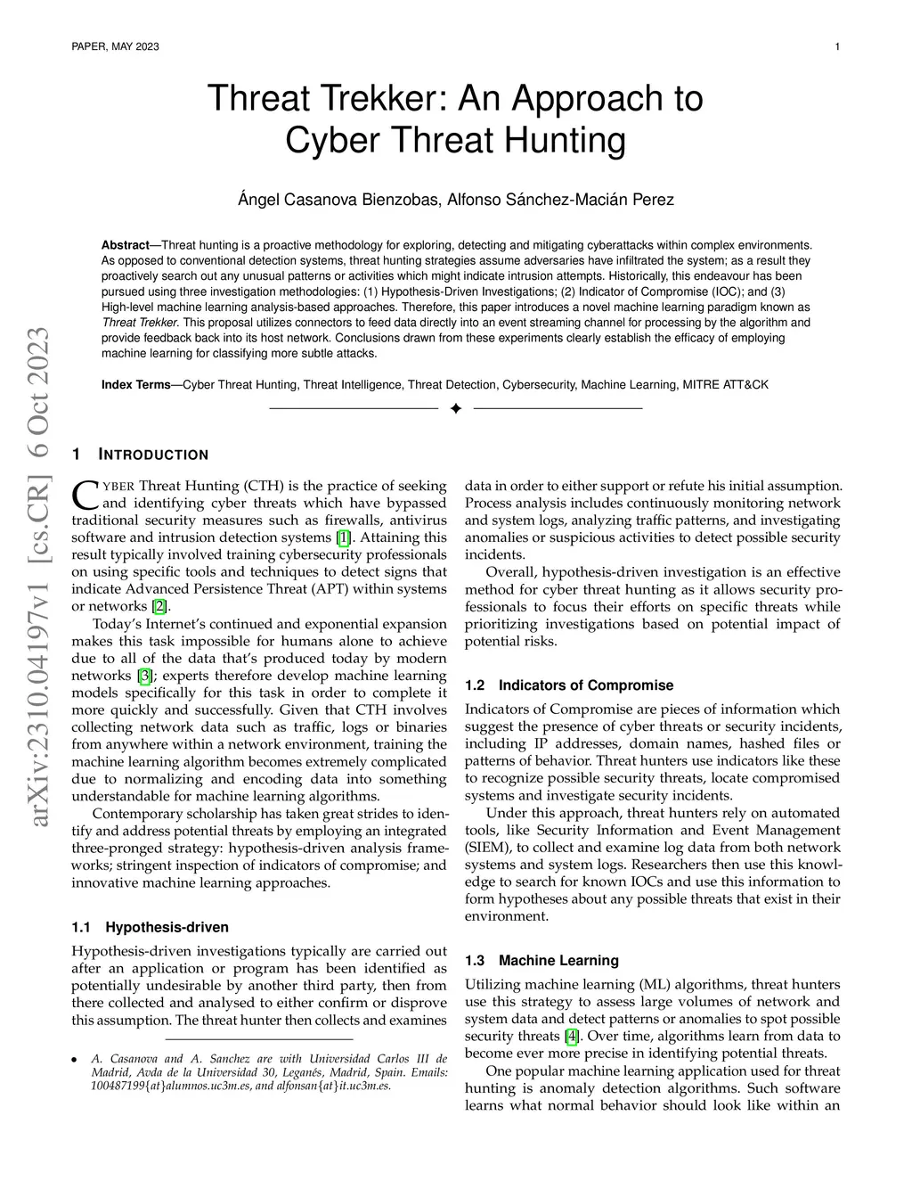 Threat hunting is a proactive methodology for exploring, detecting and mitigating cyberattacks within complex environments. As opposed to conventional detection systems, threat hunting strategies assume adversaries have infiltrated the system; as a result they proactively search out any unusual patterns or activities which might indicate intrusion attempts. Historically, this endeavour has been pursued using three investigation methodologies: (1) Hypothesis-Driven Investigations; (2) Indicator of Compromise (IOC); and (3) High-level machine learning analysis-based approaches. Therefore, this paper introduces a novel machine learning paradigm known as Threat Trekker. This proposal utilizes connectors to feed data directly into an event streaming channel for processing by the algorithm and provide feedback back into its host network. Conclusions drawn from these experiments clearly establish the efficacy of employing machine learning for classifying more subtle attacks.