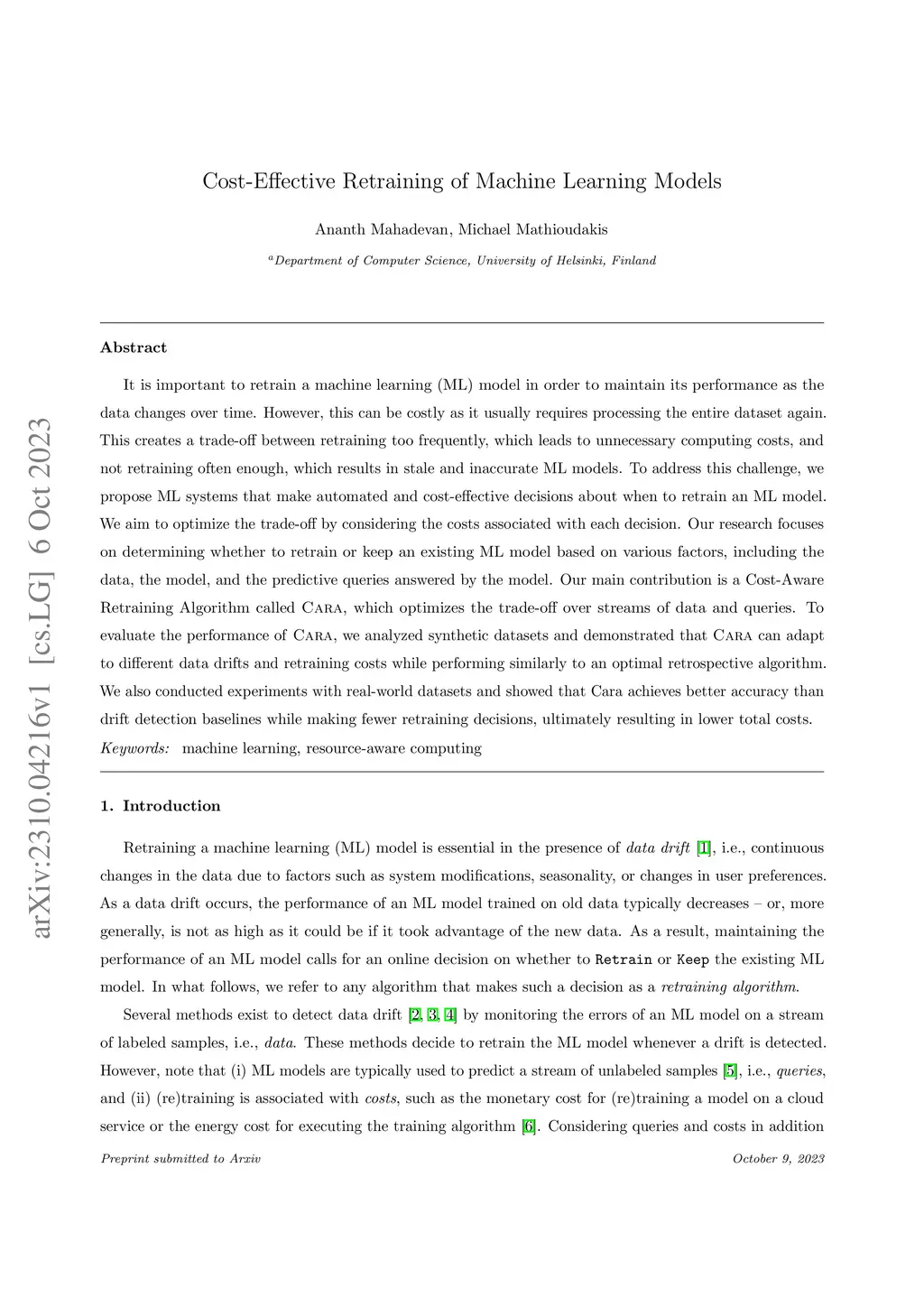It is important to retrain a machine learning (ML) model in order to maintain its performance as the data changes over time. However, this can be costly as it usually requires processing the entire dataset again. This creates a trade-off between retraining too frequently, which leads to unnecessary computing costs, and not retraining often enough, which results in stale and inaccurate ML models. To address this challenge, we propose ML systems that make automated and cost-effective decisions about when to retrain an ML model. We aim to optimize the trade-off by considering the costs associated with each decision. Our research focuses on determining whether to retrain or keep an existing ML model based on various factors, including the data, the model, and the predictive queries answered by the model. Our main contribution is a Cost-Aware Retraining Algorithm called Cara, which optimizes the trade-off over streams of data and queries. To evaluate the performance of Cara, we analyzed synthetic datasets and demonstrated that Cara can adapt to different data drifts and retraining costs while performing similarly to an optimal retrospective algorithm. We also conducted experiments with real-world datasets and showed that Cara achieves better accuracy than drift detection baselines while making fewer retraining decisions, ultimately resulting in lower total costs.