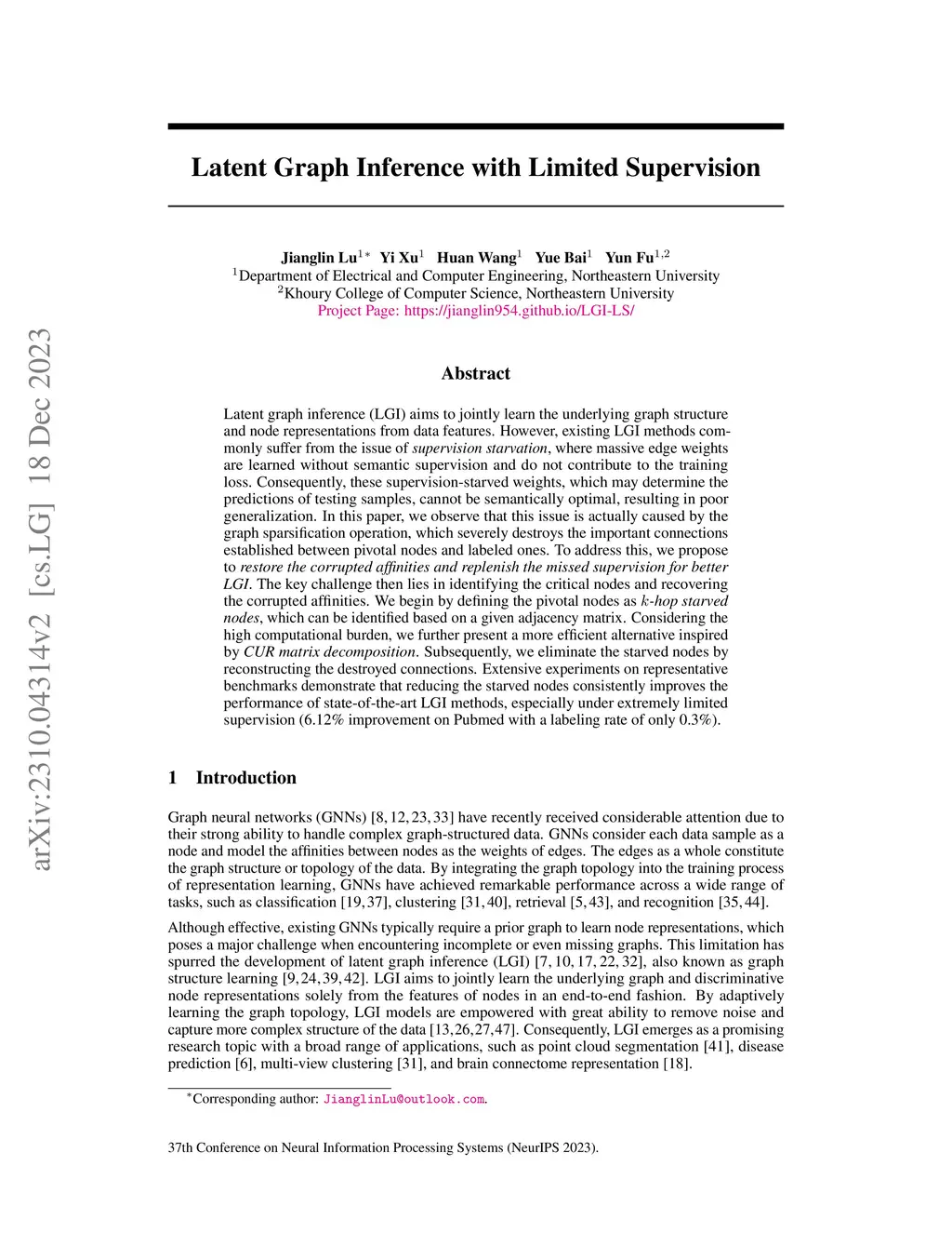 Latent graph inference (LGI) aims to jointly learn the underlying graph structure and node representations from data features. However, existing LGI methods commonly suffer from the issue of supervision starvation, where massive edge weights are learned without semantic supervision and do not contribute to the training loss. Consequently, these supervision-starved weights, which may determine the predictions of testing samples, cannot be semantically optimal, resulting in poor generalization. In this paper, we observe that this issue is actually caused by the graph sparsification operation, which severely destroys the important connections established between pivotal nodes and labeled ones. To address this, we propose to restore the corrupted affinities and replenish the missed supervision for better LGI. The key challenge then lies in identifying the critical nodes and recovering the corrupted affinities. We begin by defining the pivotal nodes as -hop starved nodes, which can be identified based on a given adjacency matrix. Considering the high computational burden, we further present a more efficient alternative inspired by CUR matrix decomposition. Subsequently, we eliminate the starved nodes by reconstructing the destroyed connections. Extensive experiments on representative benchmarks demonstrate that reducing the starved nodes consistently improves the performance of state-of-the-art LGI methods, especially under extremely limited supervision (6.12% improvement on Pubmed with a labeling rate of only 0.3%).