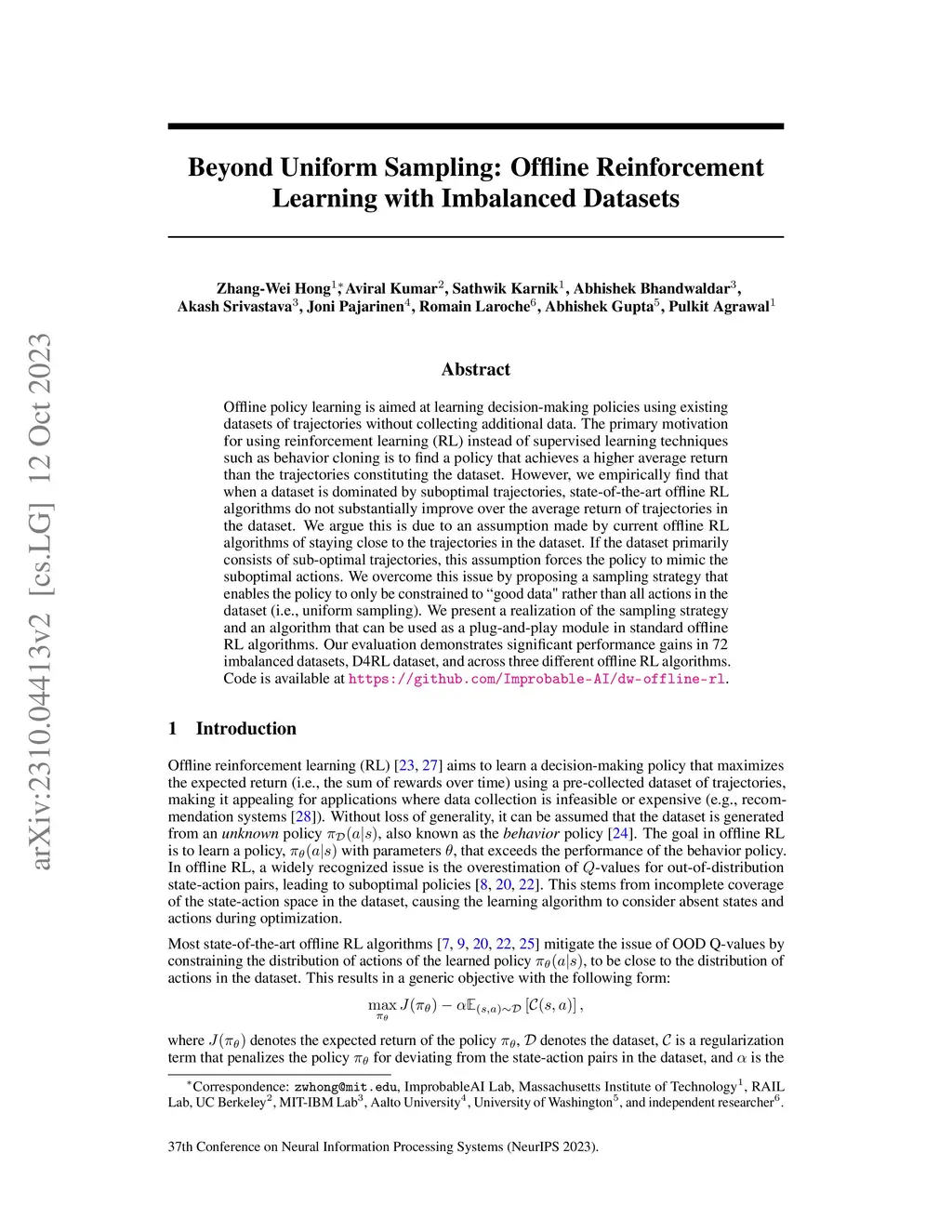Offline policy learning is aimed at learning decision-making policies using existing datasets of trajectories without collecting additional data. The primary motivation for using reinforcement learning (RL) instead of supervised learning techniques such as behavior cloning is to find a policy that achieves a higher average return than the trajectories constituting the dataset. However, we empirically find that when a dataset is dominated by suboptimal trajectories, state-of-the-art offline RL algorithms do not substantially improve over the average return of trajectories in the dataset. We argue this is due to an assumption made by current offline RL algorithms of staying close to the trajectories in the dataset. If the dataset primarily consists of sub-optimal trajectories, this assumption forces the policy to mimic the suboptimal actions. We overcome this issue by proposing a sampling strategy that enables the policy to only be constrained to ``good data" rather than all actions in the dataset (i.e., uniform sampling). We present a realization of the sampling strategy and an algorithm that can be used as a plug-and-play module in standard offline RL algorithms. Our evaluation demonstrates significant performance gains in 72 imbalanced datasets, D4RL dataset, and across three different offline RL algorithms. Code is available at https://github.com/Improbable-AI/dw-offline-rl.