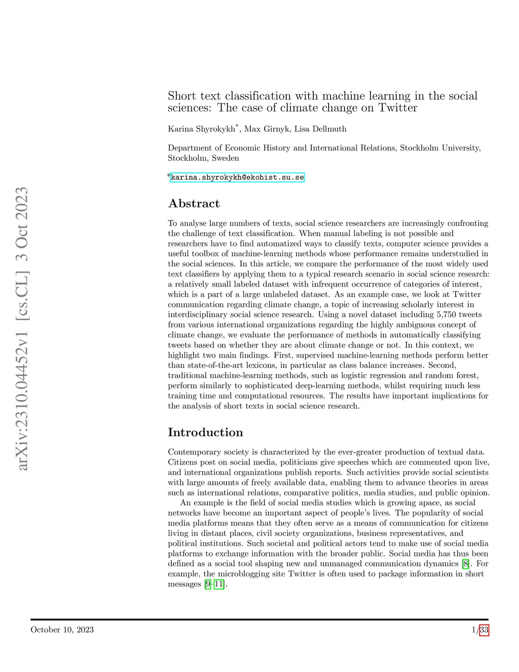 To analyse large numbers of texts, social science researchers are increasingly confronting the challenge of text classification. When manual labeling is not possible and researchers have to find automatized ways to classify texts, computer science provides a useful toolbox of machine-learning methods whose performance remains understudied in the social sciences. In this article, we compare the performance of the most widely used text classifiers by applying them to a typical research scenario in social science research: a relatively small labeled dataset with infrequent occurrence of categories of interest, which is a part of a large unlabeled dataset. As an example case, we look at Twitter communication regarding climate change, a topic of increasing scholarly interest in interdisciplinary social science research. Using a novel dataset including 5,750 tweets from various international organizations regarding the highly ambiguous concept of climate change, we evaluate the performance of methods in automatically classifying tweets based on whether they are about climate change or not. In this context, we highlight two main findings. First, supervised machine-learning methods perform better than state-of-the-art lexicons, in particular as class balance increases. Second, traditional machine-learning methods, such as logistic regression and random forest, perform similarly to sophisticated deep-learning methods, whilst requiring much less training time and computational resources. The results have important implications for the analysis of short texts in social science research.
