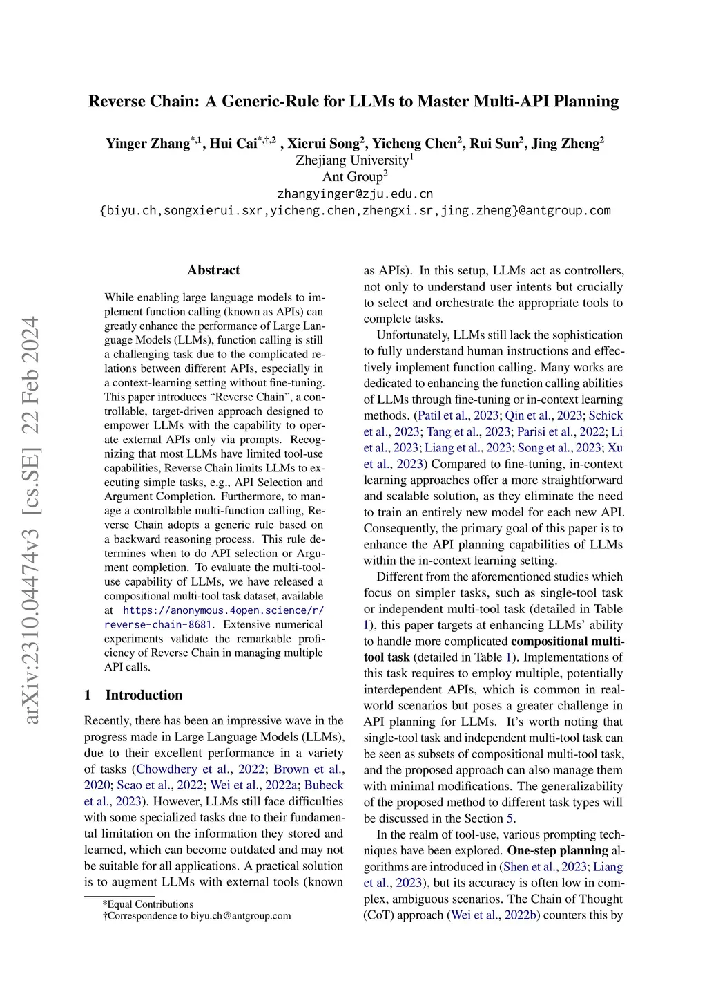 While enabling large language models to implement function calling (known as APIs) can greatly enhance the performance of Large Language Models (LLMs), function calling is still a challenging task due to the complicated relations between different APIs, especially in a context-learning setting without fine-tuning. This paper introduces ``Reverse Chain'', a controllable, target-driven approach designed to empower LLMs with the capability to operate external APIs only via prompts. Recognizing that most LLMs have limited tool-use capabilities, Reverse Chain limits LLMs to executing simple tasks, e.g., API Selection and Argument Completion. Furthermore, to manage a controllable multi-function calling, Reverse Chain adopts a generic rule based on a backward reasoning process. This rule determines when to do API selection or Argument completion. To evaluate the multi-tool-use capability of LLMs, we have released a compositional multi-tool task dataset, available at \url{https://anonymous.4open.science/r/reverse-chain-8681}. Extensive numerical experiments validate the remarkable proficiency of Reverse Chain in managing multiple API calls.