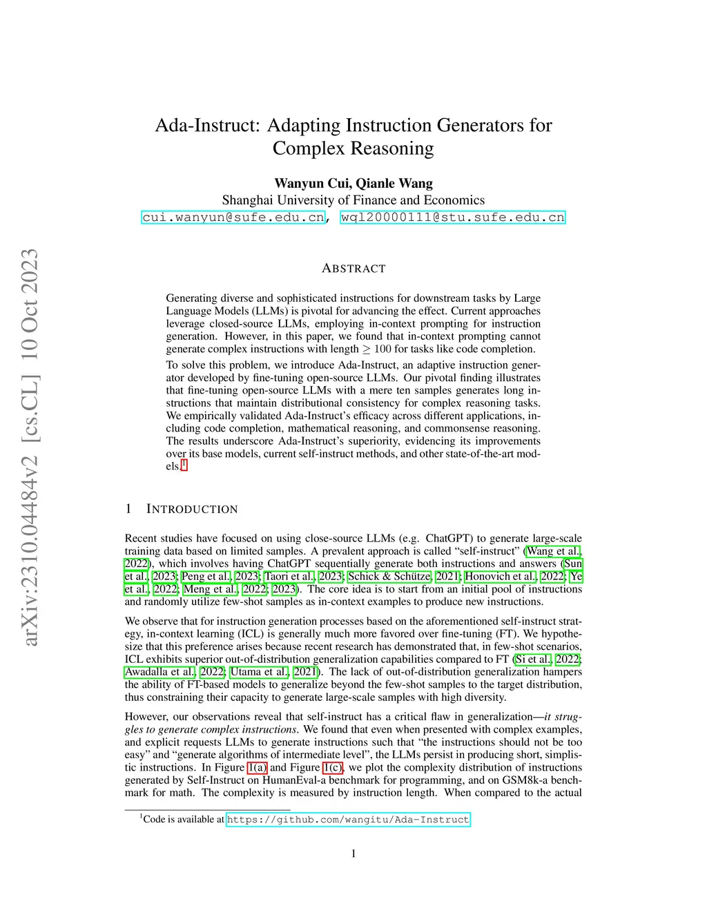 Generating diverse and sophisticated instructions for downstream tasks by Large Language Models (LLMs) is pivotal for advancing the effect. Current approaches leverage closed-source LLMs, employing in-context prompting for instruction generation. However, in this paper, we found that in-context prompting cannot generate complex instructions with length for tasks like code completion. To solve this problem, we introduce Ada-Instruct, an adaptive instruction generator developed by fine-tuning open-source LLMs. Our pivotal finding illustrates that fine-tuning open-source LLMs with a mere ten samples generates long instructions that maintain distributional consistency for complex reasoning tasks. We empirically validated Ada-Instruct's efficacy across different applications, including code completion, mathematical reasoning, and commonsense reasoning. The results underscore Ada-Instruct's superiority, evidencing its improvements over its base models, current self-instruct methods, and other state-of-the-art models.
