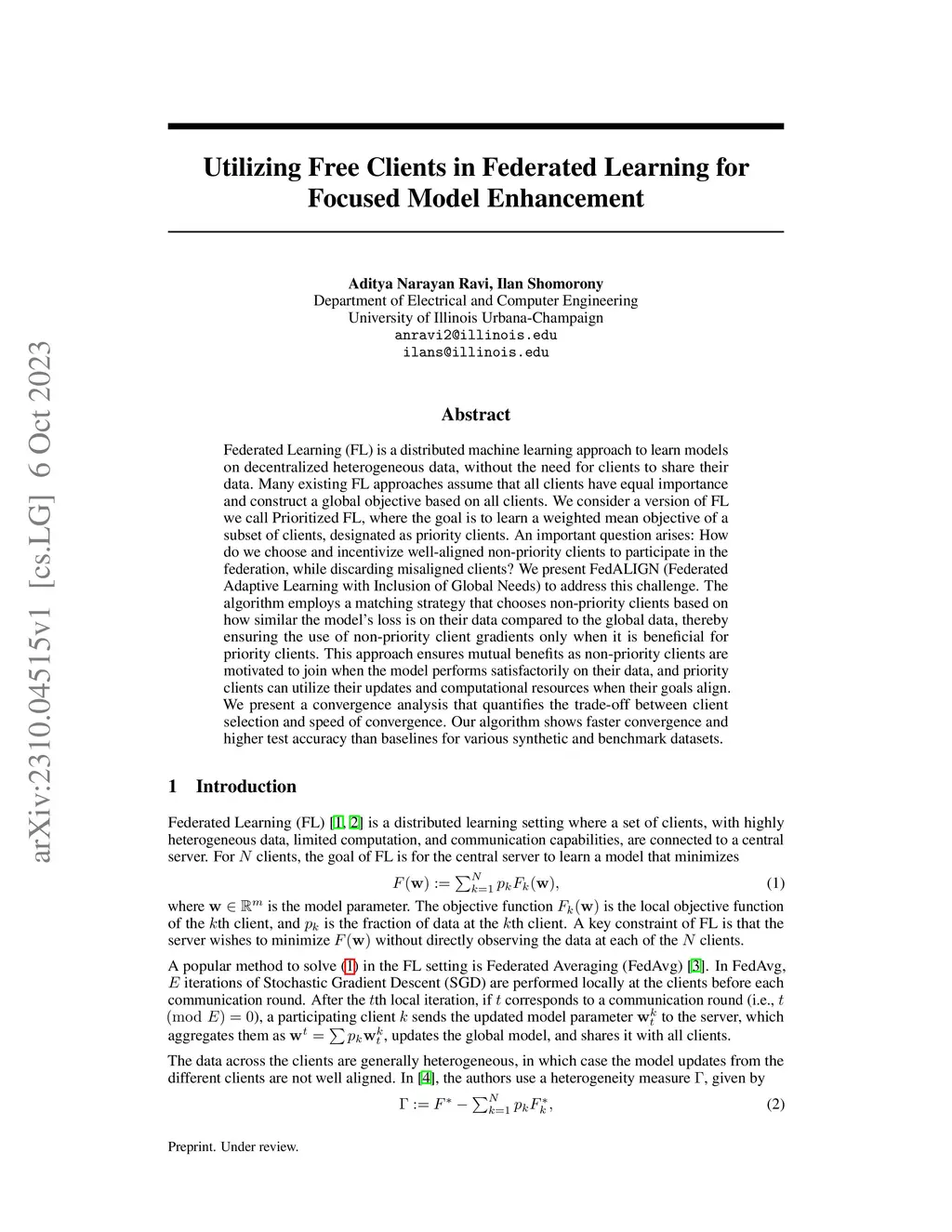 Federated Learning (FL) is a distributed machine learning approach to learn models on decentralized heterogeneous data, without the need for clients to share their data. Many existing FL approaches assume that all clients have equal importance and construct a global objective based on all clients. We consider a version of FL we call Prioritized FL, where the goal is to learn a weighted mean objective of a subset of clients, designated as priority clients. An important question arises: How do we choose and incentivize well aligned non priority clients to participate in the federation, while discarding misaligned clients? We present FedALIGN (Federated Adaptive Learning with Inclusion of Global Needs) to address this challenge. The algorithm employs a matching strategy that chooses non priority clients based on how similar the models loss is on their data compared to the global data, thereby ensuring the use of non priority client gradients only when it is beneficial for priority clients. This approach ensures mutual benefits as non priority clients are motivated to join when the model performs satisfactorily on their data, and priority clients can utilize their updates and computational resources when their goals align. We present a convergence analysis that quantifies the trade off between client selection and speed of convergence. Our algorithm shows faster convergence and higher test accuracy than baselines for various synthetic and benchmark datasets.