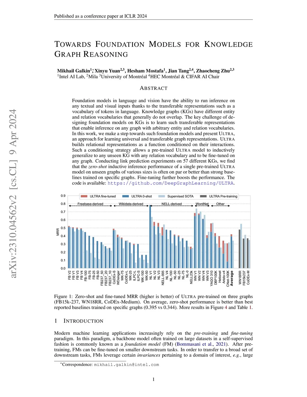 Foundation models in language and vision have the ability to run inference on any textual and visual inputs thanks to the transferable representations such as a vocabulary of tokens in language. Knowledge graphs (KGs) have different entity and relation vocabularies that generally do not overlap. The key challenge of designing foundation models on KGs is to learn such transferable representations that enable inference on any graph with arbitrary entity and relation vocabularies. In this work, we make a step towards such foundation models and present ULTRA, an approach for learning universal and transferable graph representations. ULTRA builds relational representations as a function conditioned on their interactions. Such a conditioning strategy allows a pre-trained ULTRA model to inductively generalize to any unseen KG with any relation vocabulary and to be fine-tuned on any graph. Conducting link prediction experiments on 57 different KGs, we find that the zero-shot inductive inference performance of a single pre-trained ULTRA model on unseen graphs of various sizes is often on par or better than strong baselines trained on specific graphs. Fine-tuning further boosts the performance.
