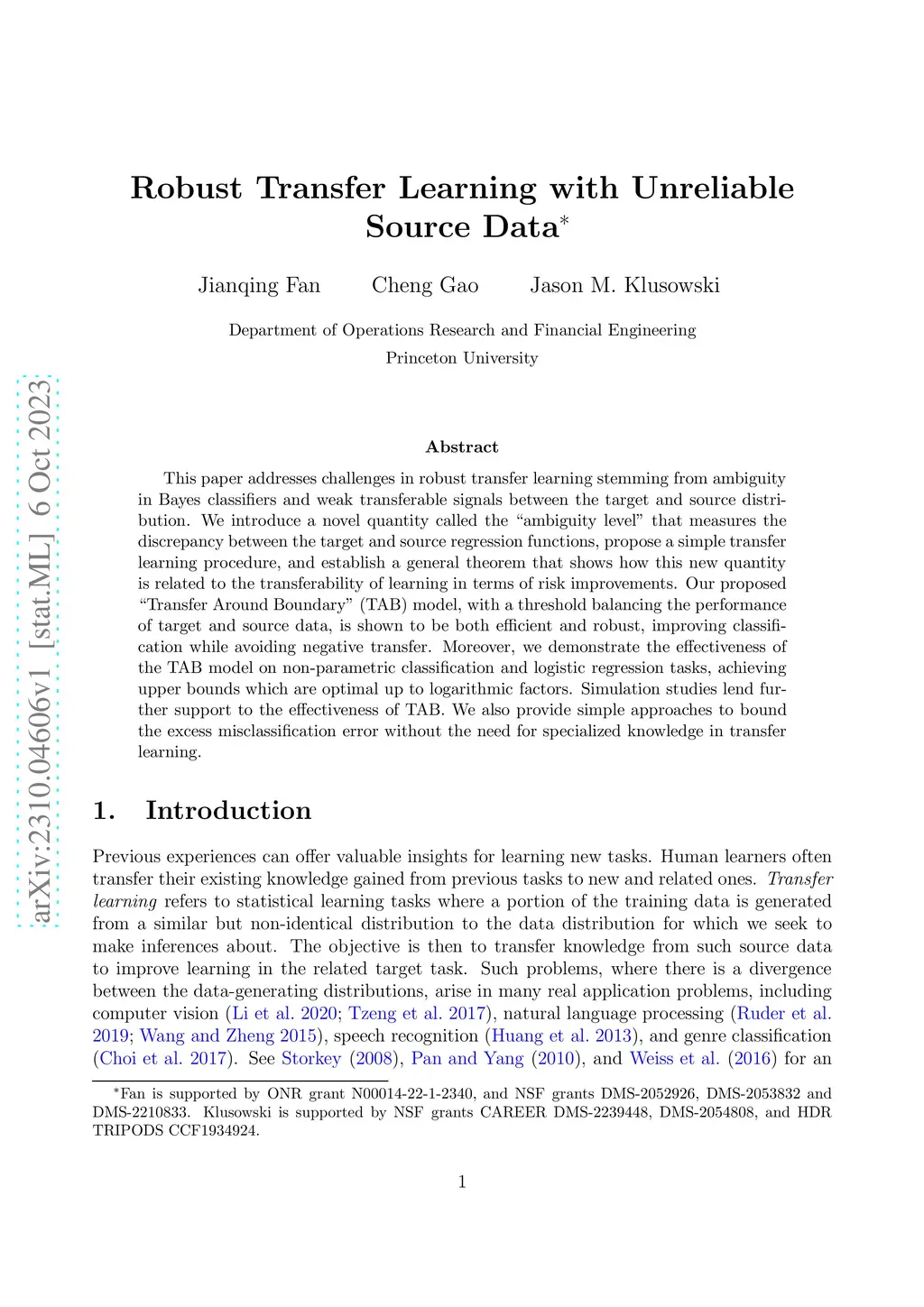 This paper addresses challenges in robust transfer learning stemming from ambiguity in Bayes classifiers and weak transferable signals between the target and source distribution. We introduce a novel quantity called the 'ámbiguity level'' that measures the discrepancy between the target and source regression functions, propose a simple transfer learning procedure, and establish a general theorem that shows how this new quantity is related to the transferability of learning in terms of risk improvements. Our proposed ''Transfer Around Boundary'' (TAB) model, with a threshold balancing the performance of target and source data, is shown to be both efficient and robust, improving classification while avoiding negative transfer. Moreover, we demonstrate the effectiveness of the TAB model on non-parametric classification and logistic regression tasks, achieving upper bounds which are optimal up to logarithmic factors. Simulation studies lend further support to the effectiveness of TAB. We also provide simple approaches to bound the excess misclassification error without the need for specialized knowledge in transfer learning.