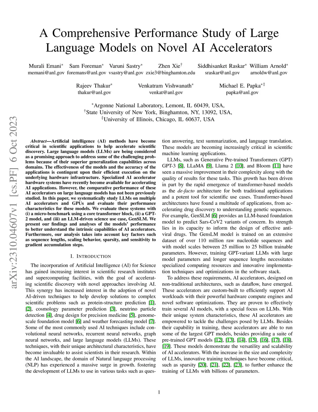 Artificial intelligence (AI) methods have become critical in scientific applications to help accelerate scientific discovery. Large language models (LLMs) are being considered as a promising approach to address some of the challenging problems because of their superior generalization capabilities across domains. The effectiveness of the models and the accuracy of the applications is contingent upon their efficient execution on the underlying hardware infrastructure. Specialized AI accelerator hardware systems have recently become available for accelerating AI applications. However, the comparative performance of these AI accelerators on large language models has not been previously studied. In this paper, we systematically study LLMs on multiple AI accelerators and GPUs and evaluate their performance characteristics for these models. We evaluate these systems with (i) a micro-benchmark using a core transformer block, (ii) a GPT- 2 model, and (iii) an LLM-driven science use case, GenSLM. We present our findings and analyses of the models' performance to better understand the intrinsic capabilities of AI accelerators. Furthermore, our analysis takes into account key factors such as sequence lengths, scaling behavior, sparsity, and sensitivity to gradient accumulation steps.