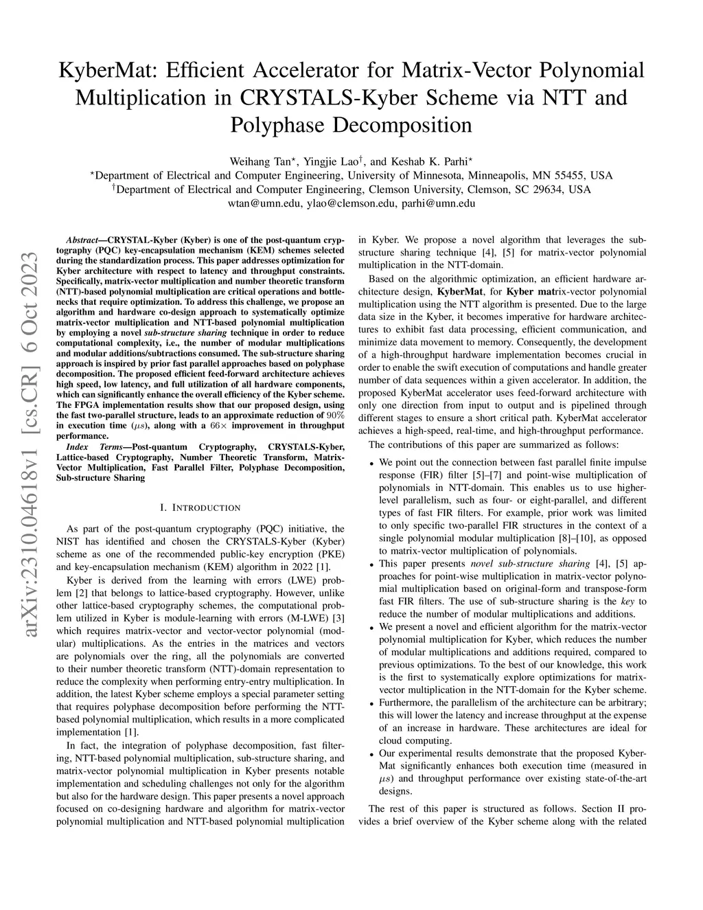 CRYSTAL-Kyber (Kyber) is one of the post-quantum cryptography (PQC) key-encapsulation mechanism (KEM) schemes selected during the standardization process. This paper addresses optimization for Kyber architecture with respect to latency and throughput constraints. Specifically, matrix-vector multiplication and number theoretic transform (NTT)-based polynomial multiplication are critical operations and bottlenecks that require optimization. To address this challenge, we propose an algorithm and hardware co-design approach to systematically optimize matrix-vector multiplication and NTT-based polynomial multiplication by employing a novel sub-structure sharing technique in order to reduce computational complexity, i.e., the number of modular multiplications and modular additions/subtractions consumed. The sub-structure sharing approach is inspired by prior fast parallel approaches based on polyphase decomposition. The proposed efficient feed-forward architecture achieves high speed, low latency, and full utilization of all hardware components, which can significantly enhance the overall efficiency of the Kyber scheme. The FPGA implementation results show that our proposed design, using the fast two-parallel structure, leads to an approximate reduction of 90% in execution time, along with a 66 times improvement in throughput performance.