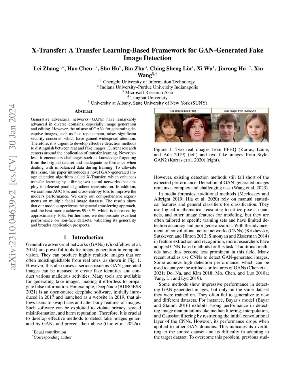 Generative adversarial networks (GANs) have remarkably advanced in diverse domains, especially image generation and editing. However, the misuse of GANs for generating deceptive images, such as face replacement, raises significant security concerns, which have gained widespread attention. Therefore, it is urgent to develop effective detection methods to distinguish between real and fake images. Current research centers around the application of transfer learning. Nevertheless, it encounters challenges such as knowledge forgetting from the original dataset and inadequate performance when dealing with imbalanced data during training. To alleviate this issue, this paper introduces a novel GAN-generated image detection algorithm called X-Transfer, which enhances transfer learning by utilizing two neural networks that employ interleaved parallel gradient transmission. In addition, we combine AUC loss and cross-entropy loss to improve the model's performance. We carry out comprehensive experiments on multiple facial image datasets. The results show that our model outperforms the general transferring approach, and the best metric achieves 99.04%, which is increased by approximately 10%. Furthermore, we demonstrate excellent performance on non-face datasets, validating its generality and broader application prospects.