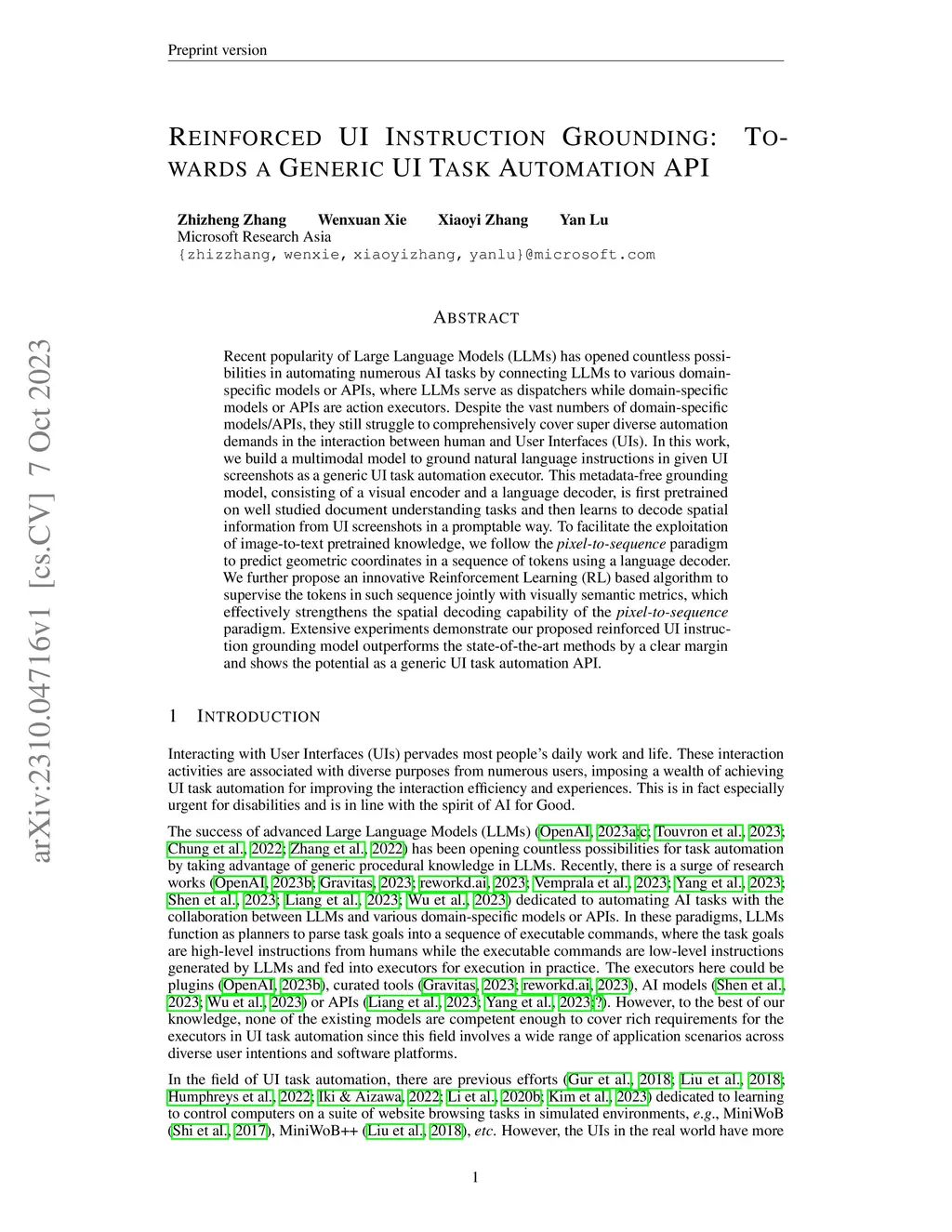 Recent popularity of Large Language Models (LLMs) has opened countless possibilities in automating numerous AI tasks by connecting LLMs to various domain-specific models or APIs, where LLMs serve as dispatchers while domain-specific models or APIs are action executors. Despite the vast numbers of domain-specific models/APIs, they still struggle to comprehensively cover super diverse automation demands in the interaction between human and User Interfaces (UIs). In this work, we build a multimodal model to ground natural language instructions in given UI screenshots as a generic UI task automation executor. This metadata-free grounding model, consisting of a visual encoder and a language decoder, is first pretrained on well studied document understanding tasks and then learns to decode spatial information from UI screenshots in a promptable way. To facilitate the exploitation of image-to-text pretrained knowledge, we follow the pixel-to-sequence paradigm to predict geometric coordinates in a sequence of tokens using a language decoder. We further propose an innovative Reinforcement Learning (RL) based algorithm to supervise the tokens in such sequence jointly with visually semantic metrics, which effectively strengthens the spatial decoding capability of the pixel-to-sequence paradigm. Extensive experiments demonstrate our proposed reinforced UI instruction grounding model outperforms the state-of-the-art methods by a clear margin and shows the potential as a generic UI task automation API.