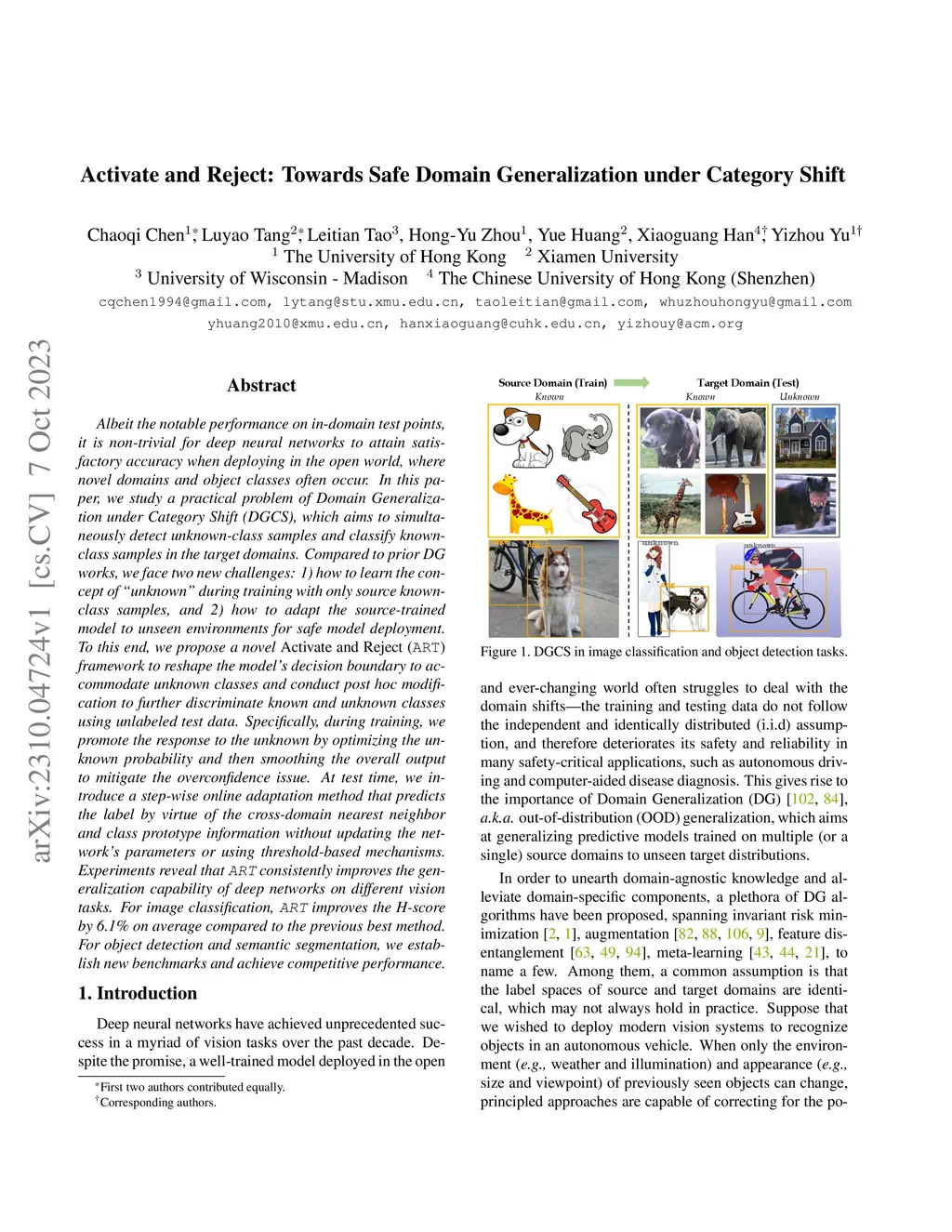Albeit the notable performance on in-domain test points, it is non-trivial for deep neural networks to attain satisfactory accuracy when deploying in the open world, where novel domains and object classes often occur. In this paper, we study a practical problem of Domain Generalization under Category Shift (DGCS), which aims to simultaneously detect unknown-class samples and classify known-class samples in the target domains. Compared to prior DG works, we face two new challenges: 1) how to learn the concept of ``unknown'' during training with only source known-class samples, and 2) how to adapt the source-trained model to unseen environments for safe model deployment. To this end, we propose a novel Activate and Reject (ART) framework to reshape the model's decision boundary to accommodate unknown classes and conduct post hoc modification to further discriminate known and unknown classes using unlabeled test data. Specifically, during training, we promote the response to the unknown by optimizing the unknown probability and then smoothing the overall output to mitigate the overconfidence issue. At test time, we introduce a step-wise online adaptation method that predicts the label by virtue of the cross-domain nearest neighbor and class prototype information without updating the network's parameters or using threshold-based mechanisms. Experiments reveal that ART consistently improves the generalization capability of deep networks on different vision tasks. For image classification, ART improves the H-score by 6.1% on average compared to the previous best method. For object detection and semantic segmentation, we establish new benchmarks and achieve competitive performance.