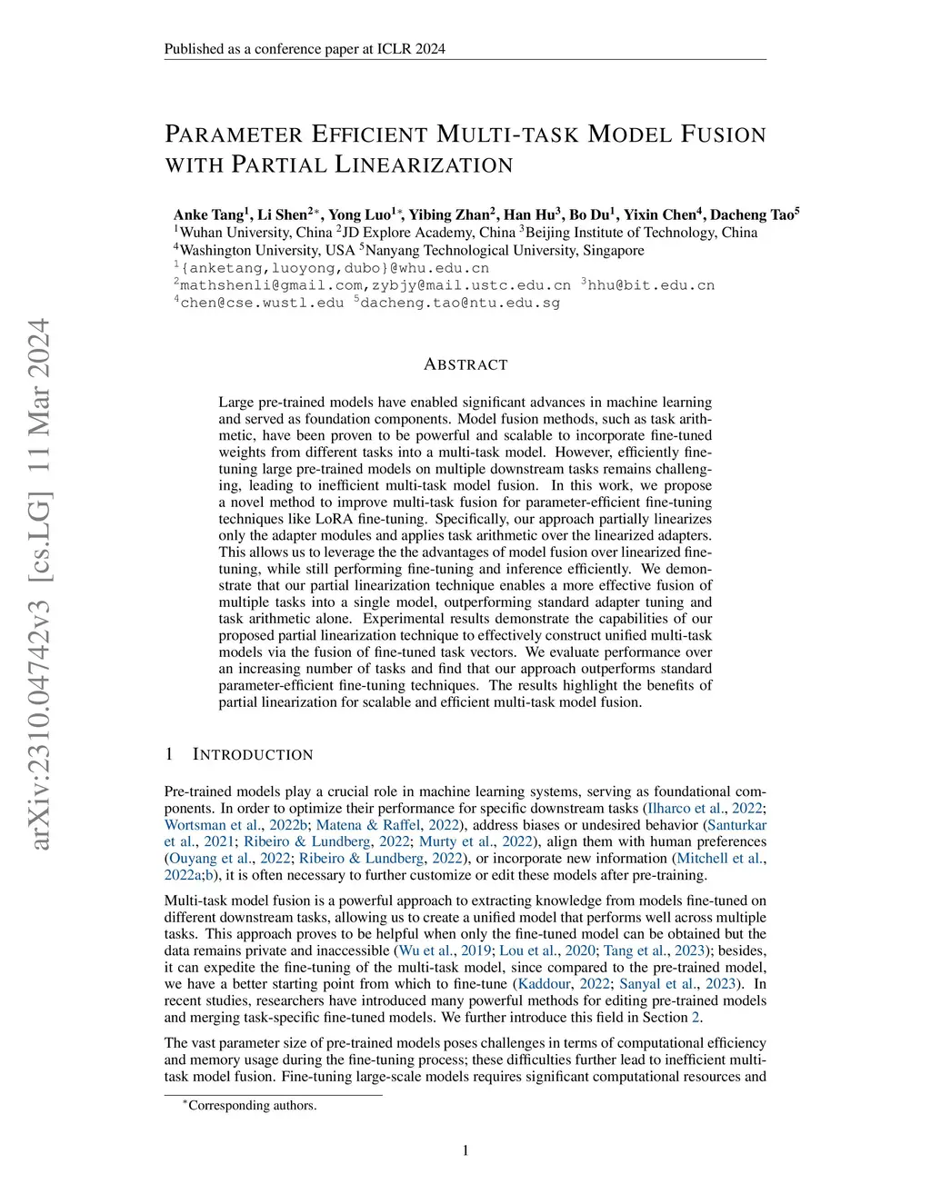 Parameter Efficient Multi-task Model Fusion with Partial Linearization