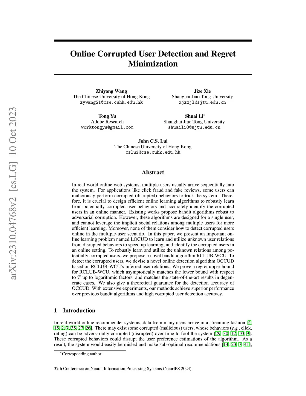 In real-world online web systems, multiple users usually arrive sequentially into the system. For applications like click fraud and fake reviews, some users can maliciously perform corrupted (disrupted) behaviors to trick the system. Therefore, it is crucial to design efficient online learning algorithms to robustly learn from potentially corrupted user behaviors and accurately identify the corrupted users in an online manner. Existing works propose bandit algorithms robust to adversarial corruption. However, these algorithms are designed for a single user, and cannot leverage the implicit social relations among multiple users for more efficient learning. Moreover, none of them consider how to detect corrupted users online in the multiple-user scenario. In this paper, we present an important online learning problem named LOCUD to learn and utilize unknown user relations from disrupted behaviors to speed up learning, and identify the corrupted users in an online setting. To robustly learn and utilize the unknown relations among potentially corrupted users, we propose a novel bandit algorithm RCLUB-WCU. To detect the corrupted users, we devise a novel online detection algorithm OCCUD based on RCLUB-WCU's inferred user relations. We prove a regret upper bound for RCLUB-WCU, which asymptotically matches the lower bound with respect to up to logarithmic factors, and matches the state-of-the-art results in degenerate cases. We also give a theoretical guarantee for the detection accuracy of OCCUD. With extensive experiments, our methods achieve superior performance over previous bandit algorithms and high corrupted user detection accuracy.