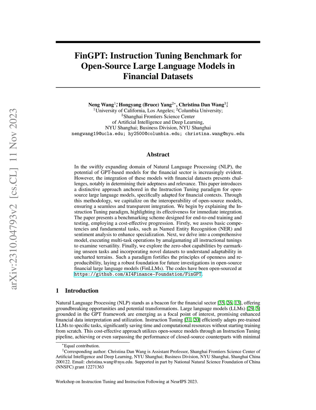 In the swiftly expanding domain of Natural Language Processing (NLP), the potential of GPT-based models for the financial sector is increasingly evident. However, the integration of these models with financial datasets presents challenges, notably in determining their adeptness and relevance. This paper introduces a distinctive approach anchored in the Instruction Tuning paradigm for open-source large language models, specifically adapted for financial contexts. Through this methodology, we capitalize on the interoperability of open-source models, ensuring a seamless and transparent integration. We begin by explaining the Instruction Tuning paradigm, highlighting its effectiveness for immediate integration. The paper presents a benchmarking scheme designed for end-to-end training and testing, employing a cost-effective progression. Firstly, we assess basic competencies and fundamental tasks, such as Named Entity Recognition (NER) and sentiment analysis to enhance specialization. Next, we delve into a comprehensive model, executing multi-task operations by amalgamating all instructional tunings to examine versatility. Finally, we explore the zero-shot capabilities by earmarking unseen tasks and incorporating novel datasets to understand adaptability in uncharted terrains. Such a paradigm fortifies the principles of openness and reproducibility, laying a robust foundation for future investigations in open-source financial large language models (FinLLMs).
