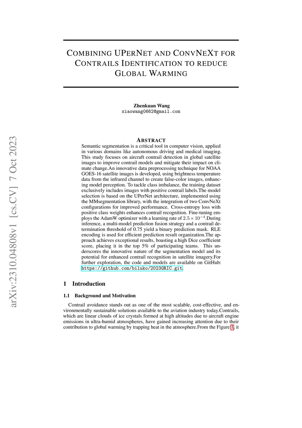 Semantic segmentation is a critical tool in computer vision, applied in various domains like autonomous driving and medical imaging. This study focuses on aircraft contrail detection in global satellite images to improve contrail models and mitigate their impact on climate change.An innovative data preprocessing technique for NOAA GOES-16 satellite images is developed, using brightness temperature data from the infrared channel to create false-color images, enhancing model perception. To tackle class imbalance, the training dataset exclusively includes images with positive contrail labels.The model selection is based on the UPerNet architecture, implemented using the MMsegmentation library, with the integration of two ConvNeXt configurations for improved performance. Cross-entropy loss with positive class weights enhances contrail recognition. Fine-tuning employs the AdamW optimizer with a learning rate of .During inference, a multi-model prediction fusion strategy and a contrail determination threshold of 0.75 yield a binary prediction mask. RLE encoding is used for efficient prediction result organization.The approach achieves exceptional results, boasting a high Dice coefficient score, placing it in the top 5\% of participating teams. This underscores the innovative nature of the segmentation model and its potential for enhanced contrail recognition in satellite imagery.For further exploration, the code and models are available on GitHub: \url{https://github.com/biluko/2023GRIC.git}.