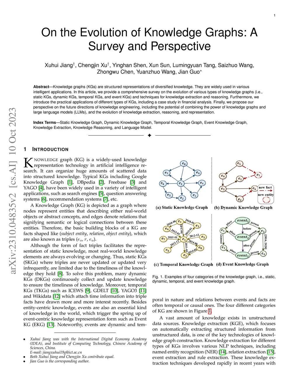 Knowledge graphs (KGs) are structured representations of diversified knowledge. They are widely used in various intelligent applications. In this article, we provide a comprehensive survey on the evolution of various types of knowledge graphs (i.e., static KGs, dynamic KGs, temporal KGs, and event KGs) and techniques for knowledge extraction and reasoning. Furthermore, we introduce the practical applications of different types of KGs, including a case study in financial analysis. Finally, we propose our perspective on the future directions of knowledge engineering, including the potential of combining the power of knowledge graphs and large language models (LLMs), and the evolution of knowledge extraction, reasoning, and representation.