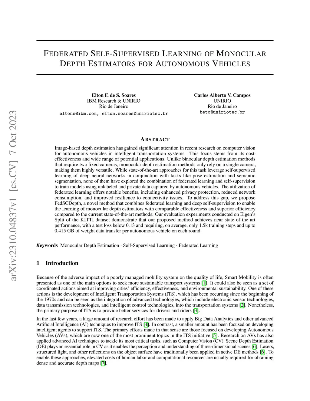 Image-based depth estimation has gained significant attention in recent research on computer vision for autonomous vehicles in intelligent transportation systems. This focus stems from its cost-effectiveness and wide range of potential applications. Unlike binocular depth estimation methods that require two fixed cameras, monocular depth estimation methods only rely on a single camera, making them highly versatile. While state-of-the-art approaches for this task leverage self-supervised learning of deep neural networks in conjunction with tasks like pose estimation and semantic segmentation, none of them have explored the combination of federated learning and self-supervision to train models using unlabeled and private data captured by autonomous vehicles. The utilization of federated learning offers notable benefits, including enhanced privacy protection, reduced network consumption, and improved resilience to connectivity issues. To address this gap, we propose FedSCDepth, a novel method that combines federated learning and deep self-supervision to enable the learning of monocular depth estimators with comparable effectiveness and superior efficiency compared to the current state-of-the-art methods. Our evaluation experiments conducted on Eigen's Split of the KITTI dataset demonstrate that our proposed method achieves near state-of-the-art performance, with a test loss below 0.13 and requiring, on average, only 1.5k training steps and up to 0.415 GB of weight data transfer per autonomous vehicle on each round.