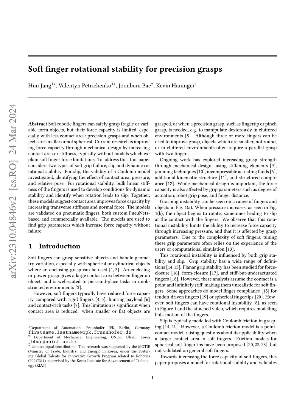 Soft finger rotational stability for precision grasps