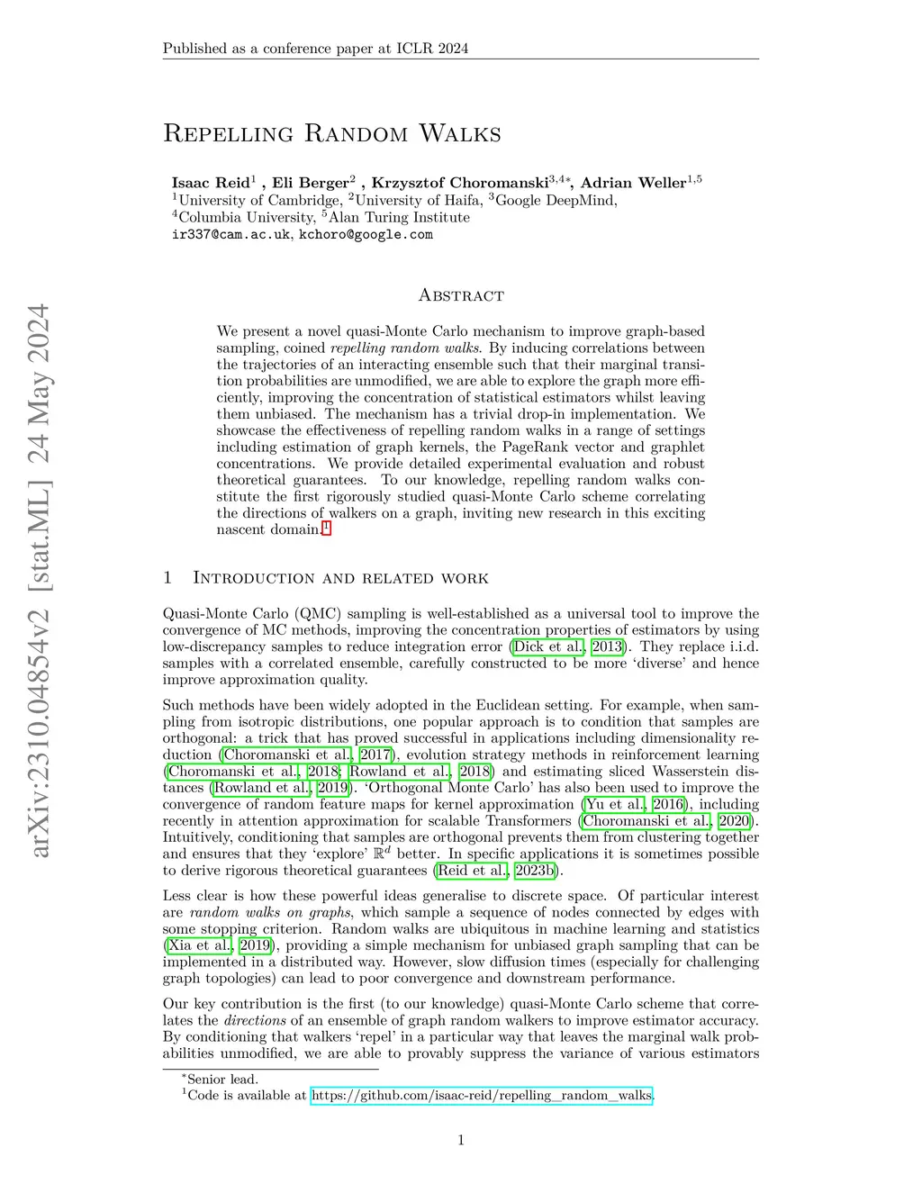 We present a novel quasi-Monte Carlo mechanism to improve graph-based sampling, coined repelling random walks. By inducing correlations between the trajectories of an interacting ensemble such that their marginal transition probabilities are unmodified, we are able to explore the graph more efficiently, improving the concentration of statistical estimators whilst leaving them unbiased. The mechanism has a trivial drop-in implementation. We showcase the effectiveness of repelling random walks in a range of settings including estimation of graph kernels, the PageRank vector and graphlet concentrations. We provide detailed experimental evaluation and robust theoretical guarantees. To our knowledge, repelling random walks constitute the first rigorously studied quasi-Monte Carlo scheme correlating the directions of walkers on a graph, inviting new research in this exciting nascent domain.