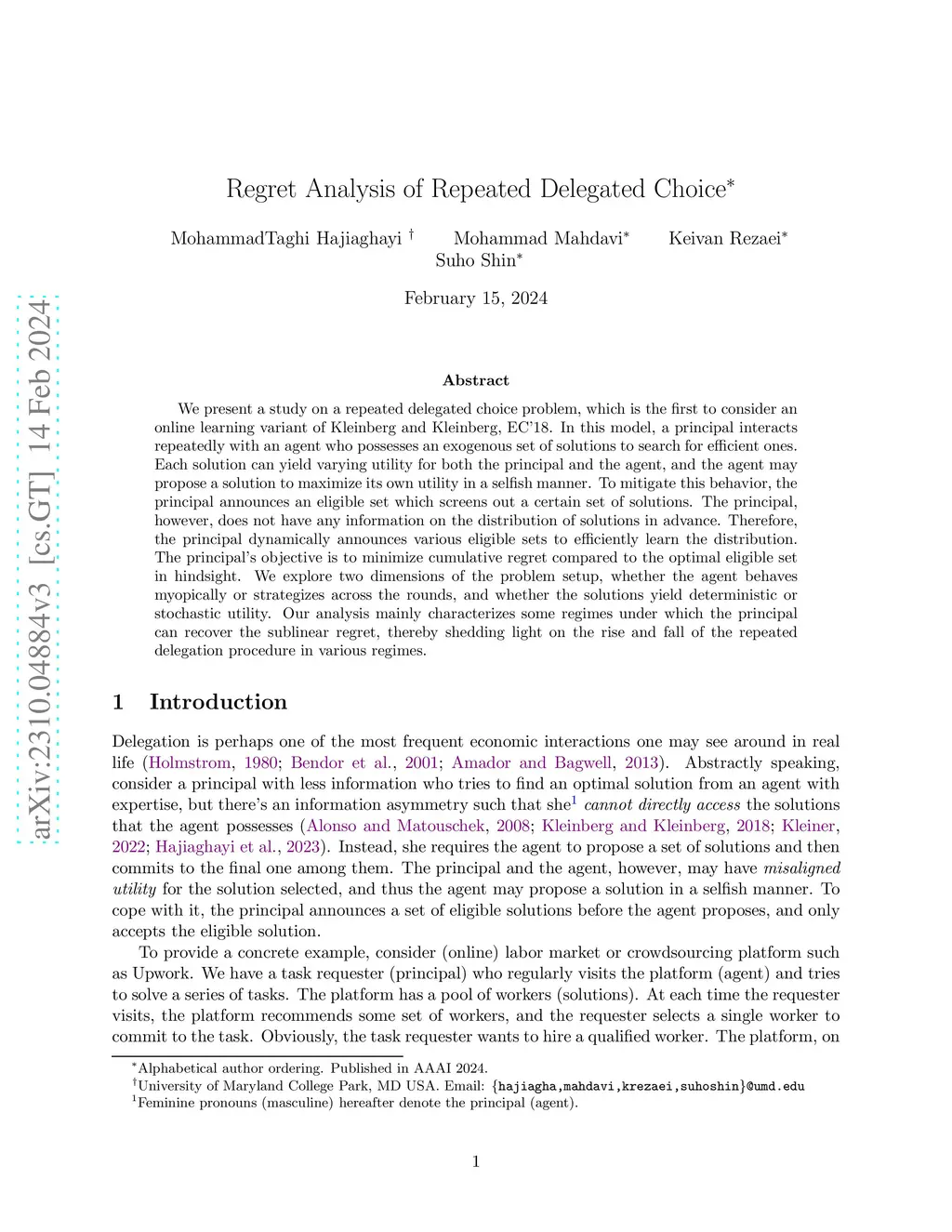 We present a study on a repeated delegated choice problem, which is the first to consider an online learning variant of Kleinberg and Kleinberg, EC'18. In this model, a principal interacts repeatedly with an agent who possesses an exogenous set of solutions to search for efficient ones. Each solution can yield varying utility for both the principal and the agent, and the agent may propose a solution to maximize its own utility in a selfish manner. To mitigate this behavior, the principal announces an eligible set which screens out a certain set of solutions. The principal, however, does not have any information on the distribution of solutions in advance. Therefore, the principal dynamically announces various eligible sets to efficiently learn the distribution. The principal's objective is to minimize cumulative regret compared to the optimal eligible set in hindsight. We explore two dimensions of the problem setup, whether the agent behaves myopically or strategizes across the rounds, and whether the solutions yield deterministic or stochastic utility. Our analysis mainly characterizes some regimes under which the principal can recover the sublinear regret, thereby shedding light on the rise and fall of the repeated delegation procedure in various regimes.