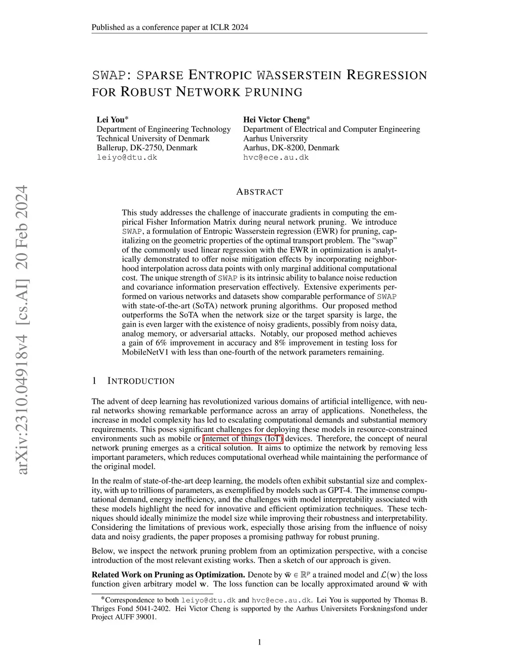 SWAP: Sparse Entropic Wasserstein Regression for Robust Network Pruning