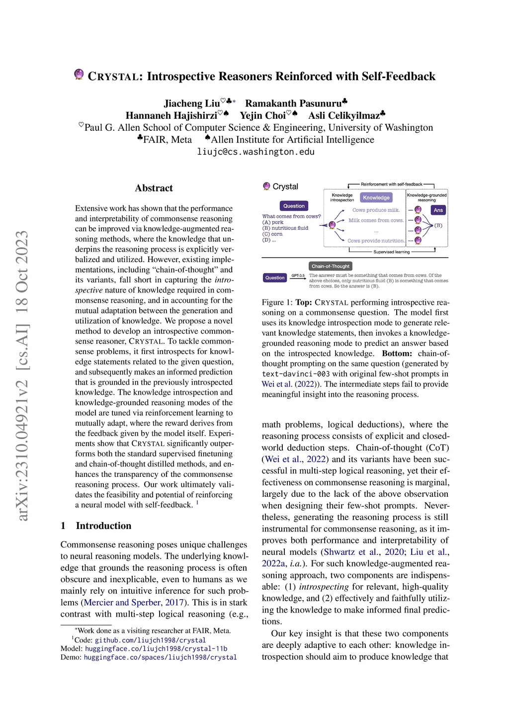 Crystal: Introspective Reasoners Reinforced with Self-Feedback