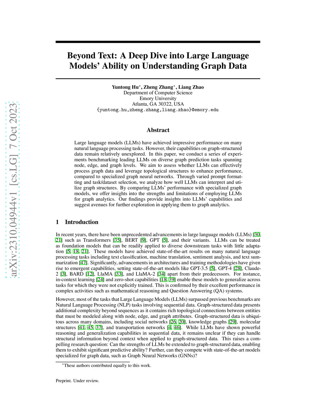 Large language models (LLMs) have achieved impressive performance on many natural language processing tasks. However, their capabilities on graph-structured data remain relatively unexplored. In this paper, we conduct a series of experiments benchmarking leading LLMs on diverse graph prediction tasks spanning node, edge, and graph levels. We aim to assess whether LLMs can effectively process graph data and leverage topological structures to enhance performance, compared to specialized graph neural networks. Through varied prompt formatting and task/dataset selection, we analyze how well LLMs can interpret and utilize graph structures. By comparing LLMs' performance with specialized graph models, we offer insights into the strengths and limitations of employing LLMs for graph analytics. Our findings provide insights into LLMs' capabilities and suggest avenues for further exploration in applying them to graph analytics.