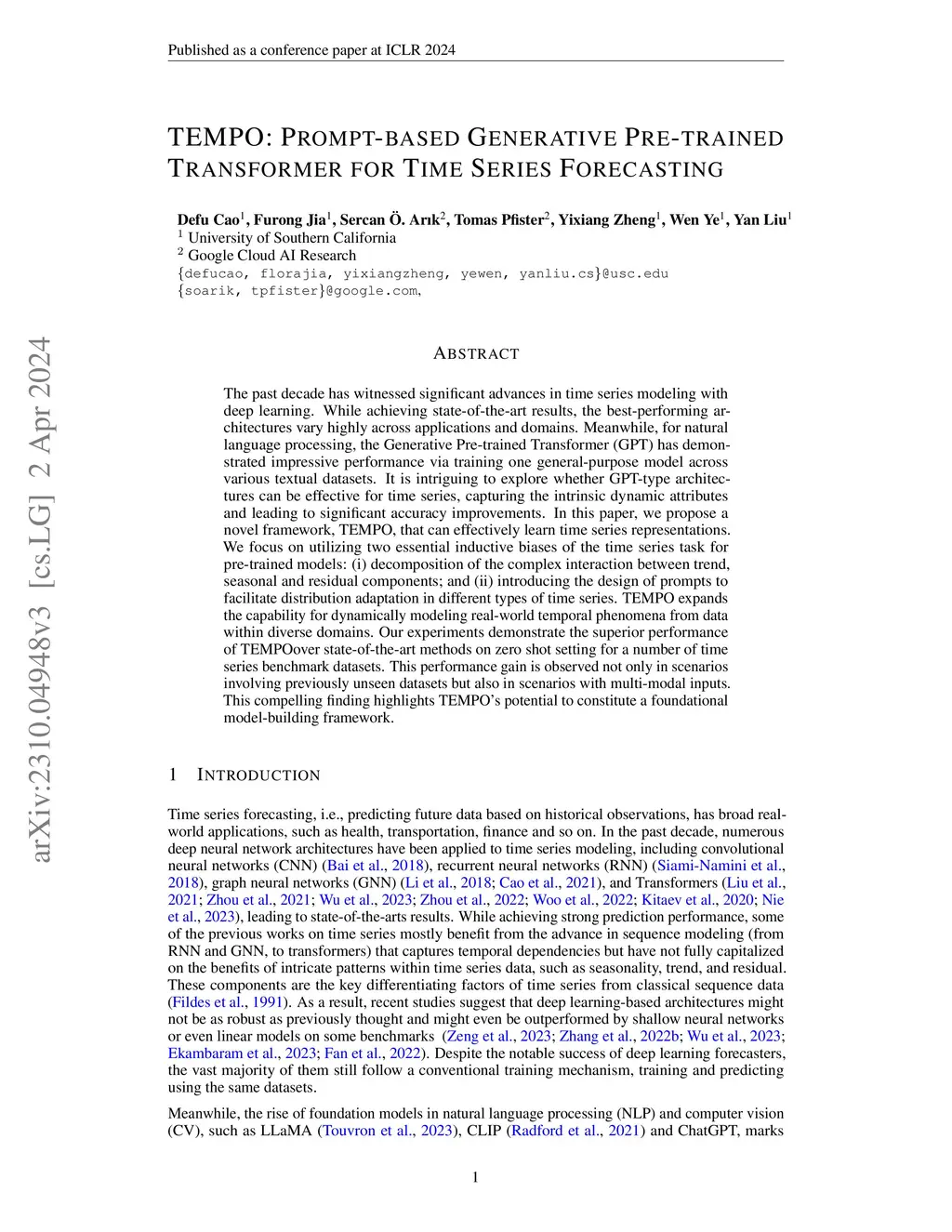 The past decade has witnessed significant advances in time series modeling with deep learning. While achieving state-of-the-art results, the best-performing architectures vary highly across applications and domains. Meanwhile, for natural language processing, the Generative Pre-trained Transformer (GPT) has demonstrated impressive performance via training one general-purpose model across various textual datasets. It is intriguing to explore whether GPT-type architectures can be effective for time series, capturing the intrinsic dynamic attributes and leading to significant accuracy improvements. In this paper, we propose a novel framework, TEMPO, that can effectively learn time series representations. We focus on utilizing two essential inductive biases of the time series task for pre-trained models: (i) decomposition of the complex interaction between trend, seasonal and residual components; and (ii) introducing the design of prompts to facilitate distribution adaptation in different types of time series. TEMPO expands the capability for dynamically modeling real-world temporal phenomena from data within diverse domains. Our experiments demonstrate the superior performance of TEMPO over state-of-the-art methods on zero shot setting for a number of time series benchmark datasets. This performance gain is observed not only in scenarios involving previously unseen datasets but also in scenarios with multi-modal inputs. This compelling finding highlights TEMPO's potential to constitute a foundational model-building framework.