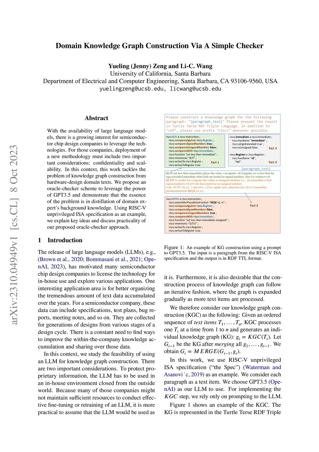 With the availability of large language models, there is a growing interest for semiconductor chip design companies to leverage the technologies. For those companies, deployment of a new methodology must include two important considerations: confidentiality and scalability. In this context, this work tackles the problem of knowledge graph construction from hardware-design domain texts. We propose an oracle-checker scheme to leverage the power of GPT3.5 and demonstrate that the essence of the problem is in distillation of domain expert's background knowledge. Using RISC-V unprivileged ISA specification as an example, we explain key ideas and discuss practicality of our proposed oracle-checker approach.