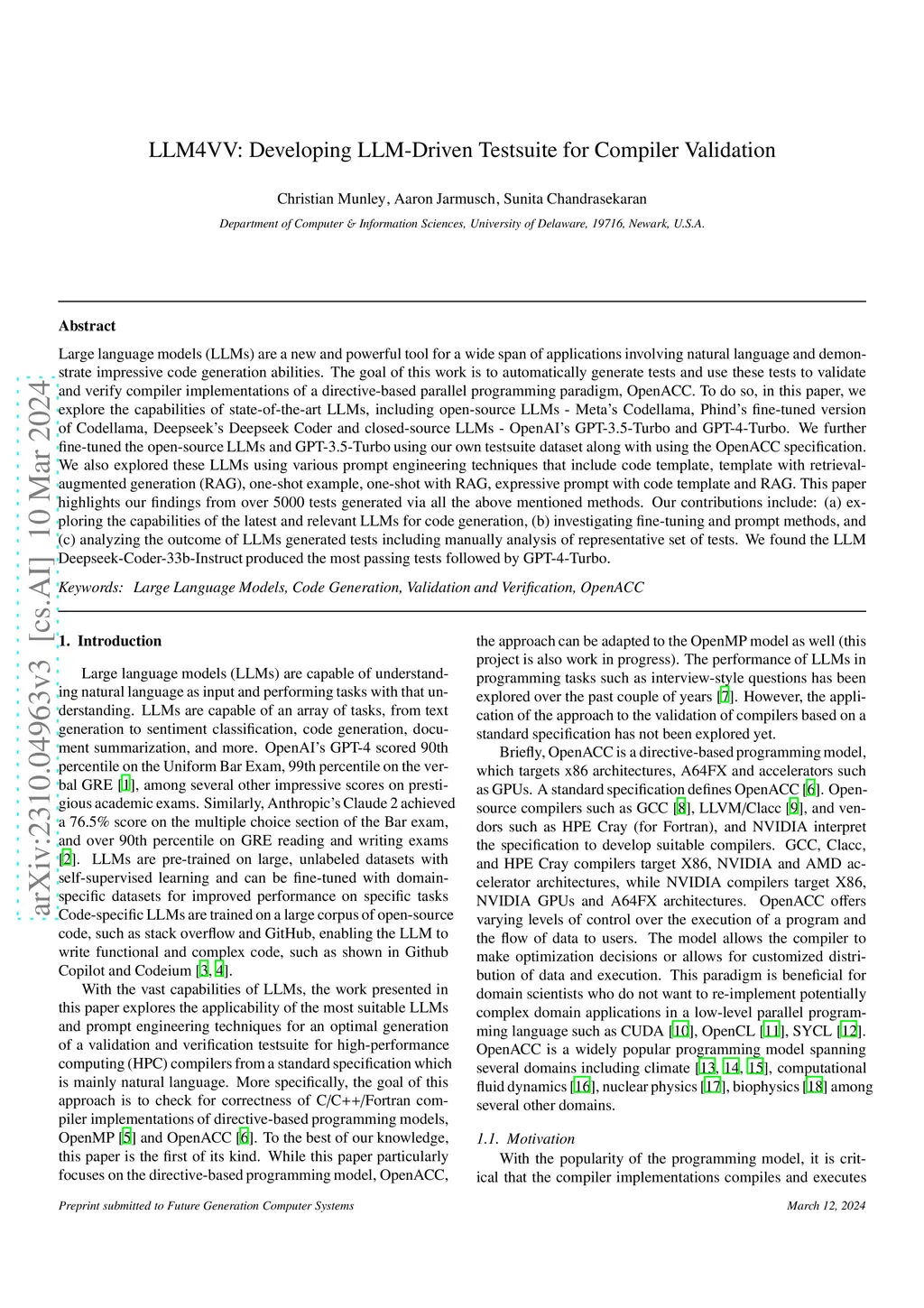Large language models (LLMs) are a new and powerful tool for a wide span of applications involving natural language and demonstrate impressive code generation abilities. The goal of this work is to automatically generate tests and use these tests to validate and verify compiler implementations of a directive-based parallel programming paradigm, OpenACC. To do so, in this paper, we explore the capabilities of state-of-the-art LLMs, including open-source LLMs -- Meta Codellama, Phind fine-tuned version of Codellama, Deepseek Deepseek Coder and closed-source LLMs -- OpenAI GPT-3.5-Turbo and GPT-4-Turbo. We further fine-tuned the open-source LLMs and GPT-3.5-Turbo using our own testsuite dataset along with using the OpenACC specification. We also explored these LLMs using various prompt engineering techniques that include code template, template with retrieval-augmented generation (RAG), one-shot example, one-shot with RAG, expressive prompt with code template and RAG. This paper highlights our findings from over 5000 tests generated via all the above mentioned methods. Our contributions include: (a) exploring the capabilities of the latest and relevant LLMs for code generation, (b) investigating fine-tuning and prompt methods, and (c) analyzing the outcome of LLMs generated tests including manually analysis of representative set of tests. We found the LLM Deepseek-Coder-33b-Instruct produced the most passing tests followed by GPT-4-Turbo.
