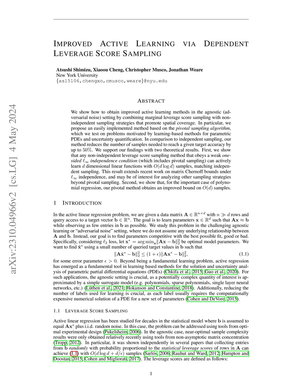 We show how to obtain improved active learning methods in the agnostic (adversarial noise) setting by combining marginal leverage score sampling with non-independent sampling strategies that promote spatial coverage. In particular, we propose an easily implemented method based on the \emph{pivotal sampling algorithm}, which we test on problems motivated by learning-based methods for parametric PDEs and uncertainty quantification. In comparison to independent sampling, our method reduces the number of samples needed to reach a given target accuracy by up to . We support our findings with two theoretical results. First, we show that any non-independent leverage score sampling method that obeys a weak \emph{one-sided independence condition} (which includes pivotal sampling) can actively learn dimensional linear functions with samples, matching independent sampling. This result extends recent work on matrix Chernoff bounds under independence, and may be of interest for analyzing other sampling strategies beyond pivotal sampling. Second, we show that, for the important case of polynomial regression, our pivotal method obtains an improved bound on samples.