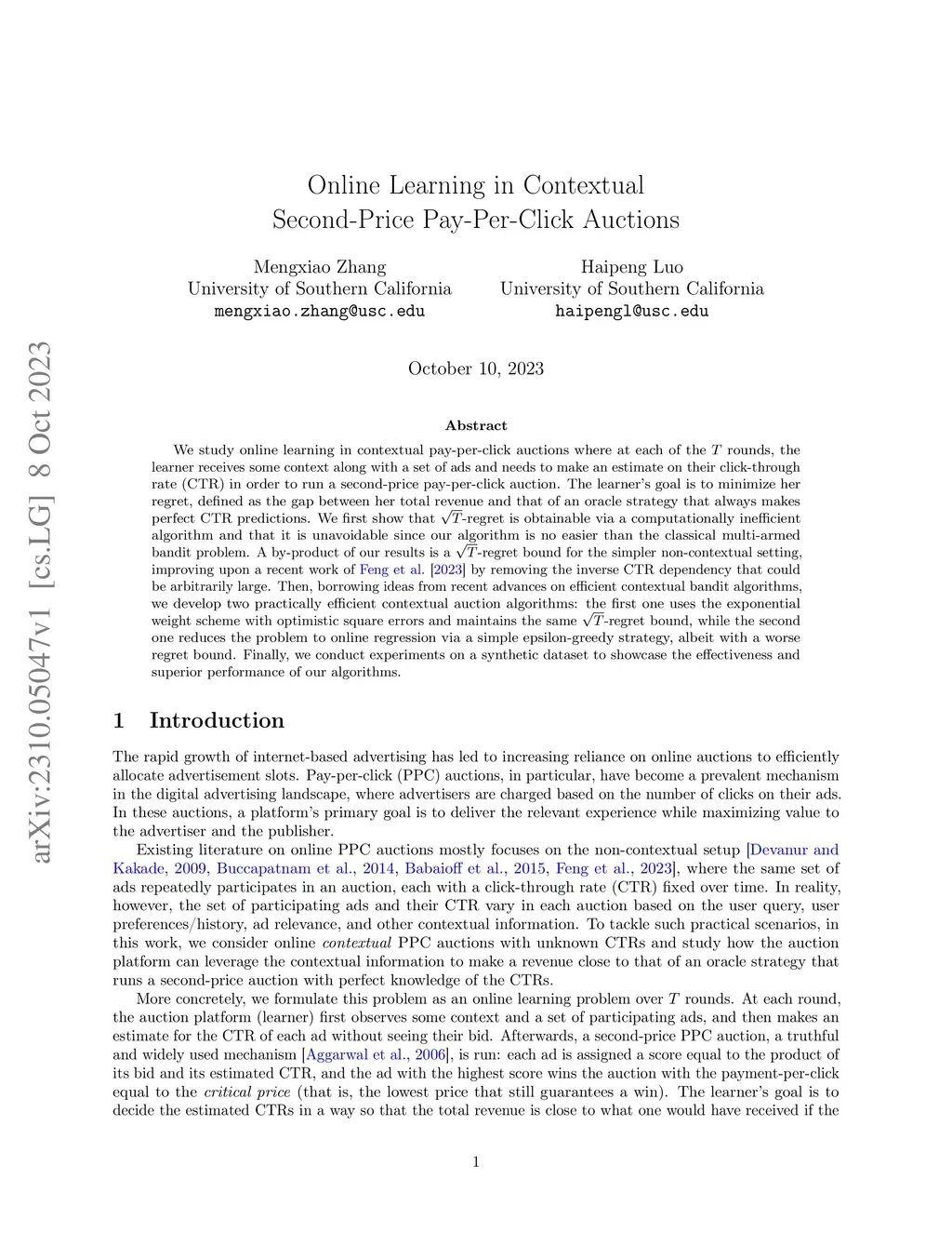 We study online learning in contextual pay-per-click auctions where at each of the rounds, the learner receives some context along with a set of ads and needs to make an estimate on their click-through rate (CTR) in order to run a second-price pay-per-click auction. The learner's goal is to minimize her regret, defined as the gap between her total revenue and that of an oracle strategy that always makes perfect CTR predictions. We first show that -regret is obtainable via a computationally inefficient algorithm and that it is unavoidable since our algorithm is no easier than the classical multi-armed bandit problem. A by-product of our results is a -regret bound for the simpler non-contextual setting, improving upon a recent work of [Feng et al., 2023] by removing the inverse CTR dependency that could be arbitrarily large. Then, borrowing ideas from recent advances on efficient contextual bandit algorithms, we develop two practically efficient contextual auction algorithms: the first one uses the exponential weight scheme with optimistic square errors and maintains the same -regret bound, while the second one reduces the problem to online regression via a simple epsilon-greedy strategy, albeit with a worse regret bound. Finally, we conduct experiments on a synthetic dataset to showcase the effectiveness and superior performance of our algorithms.