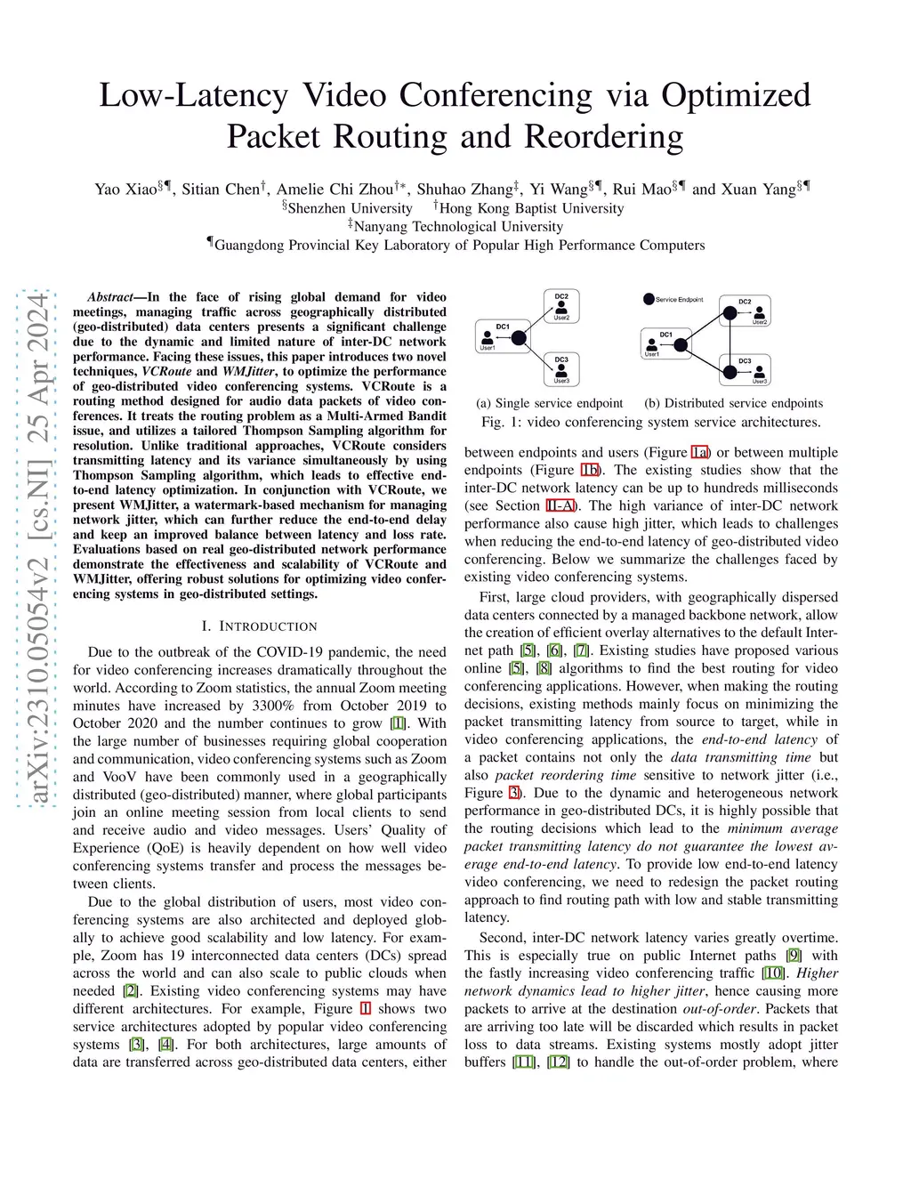 In the face of rising global demand for video meetings, managing traffic across geographically distributed (geo-distributed) data centers presents a significant challenge due to the dynamic and limited nature of inter-DC network performance. Facing these issues, this paper introduces two novel techniques, VCRoute and WMJitter, to optimize the performance of geo-distributed video conferencing systems. VCRoute is a routing method designed for audio data packets of video conferences. It treats the routing problem as a Multi-Armed Bandit issue, and utilizes a tailored Thompson Sampling algorithm for resolution. Unlike traditional approaches, VCRoute considers transmitting latency and its variance simultaneously by using Thompson Sampling algorithm, which leads to effective end-to-end latency optimization. In conjunction with VCRoute, we present WMJitter, a watermark-based mechanism for managing network jitter, which can further reduce the end-to-end delay and keep an improved balance between latency and loss rate. Evaluations based on real geo-distributed network performance demonstrate the effectiveness and scalability of VCRoute and WMJitter, offering robust solutions for optimizing video conferencing systems in geo-distributed settings.
