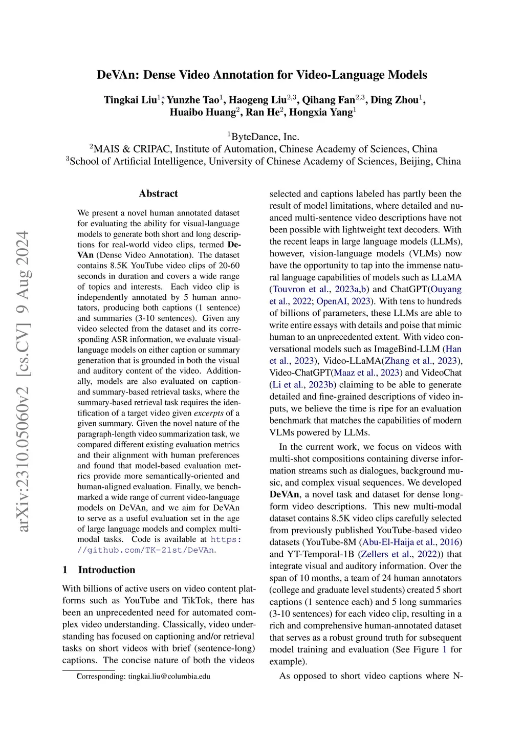 We present a novel task and human annotated dataset for evaluating the ability for visual-language models to generate captions and summaries for real-world video clips, which we call Video-CSR (Captioning, Summarization and Retrieval). The dataset contains 4.8K YouTube video clips of 20-60 seconds in duration and covers a wide range of topics and interests. Each video clip corresponds to 5 independently annotated captions (1 sentence) and summaries (3-10 sentences). Given any video selected from the dataset and its corresponding ASR information, we evaluate visual-language models on either caption or summary generation that is grounded in both the visual and auditory content of the video. Additionally, models are also evaluated on caption- and summary-based retrieval tasks, where the summary-based retrieval task requires the identification of a target video given excerpts of a corresponding summary. Given the novel nature of the paragraph-length video summarization task, we perform extensive comparative analyses of different existing evaluation metrics and their alignment with human preferences. Finally, we propose a foundation model with competitive generation and retrieval capabilities that serves as a baseline for the Video-CSR task. We aim for Video-CSR to serve as a useful evaluation set in the age of large language models and complex multi-modal tasks.