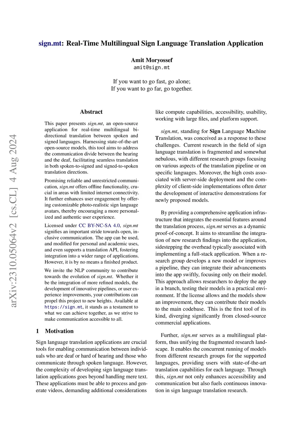 This demo paper presents sign.mt, an open-source application pioneering real-time multilingual bi-directional translation between spoken and signed languages. Harnessing state-of-the-art open-source models, this tool aims to address the communication divide between the hearing and the deaf, facilitating seamless translation in both spoken-to-signed and signed-to-spoken translation directions. Promising reliable and unrestricted communication, sign.mt offers offline functionality, crucial in areas with limited internet connectivity. It further enhances user engagement by offering customizable photo-realistic sign language avatars, thereby encouraging a more personalized and authentic user experience. Licensed under CC BY-NC-SA 4.0, sign.mt signifies an important stride towards open, inclusive communication. The app can be used, and modified for personal and academic uses, and even supports a translation API, fostering integration into a wider range of applications. However, it is by no means a finished product. We invite the NLP community to contribute towards the evolution of sign.mt. Whether it be the integration of more refined models, the development of innovative pipelines, or user experience improvements, your contributions can propel this project to new heights. Available at https://sign.mt, it stands as a testament to what we can achieve together, as we strive to make communication accessible to all.