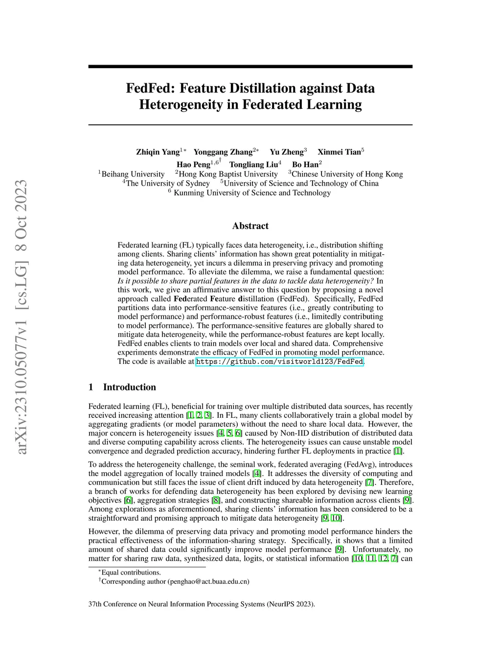 Federated learning (FL) typically faces data heterogeneity, i.e., distribution shifting among clients. Sharing clients' information has shown great potentiality in mitigating data heterogeneity, yet incurs a dilemma in preserving privacy and promoting model performance. To alleviate the dilemma, we raise a fundamental question: \textit{Is it possible to share partial features in the data to tackle data heterogeneity?} In this work, we give an affirmative answer to this question by proposing a novel approach called {\textbf{Fed}erated \textbf{Fe}ature \textbf{d}istillation} (FedFed). Specifically, FedFed partitions data into performance-sensitive features (i.e., greatly contributing to model performance) and performance-robust features (i.e., limitedly contributing to model performance). The performance-sensitive features are globally shared to mitigate data heterogeneity, while the performance-robust features are kept locally. FedFed enables clients to train models over local and shared data. Comprehensive experiments demonstrate the efficacy of FedFed in promoting model performance.
