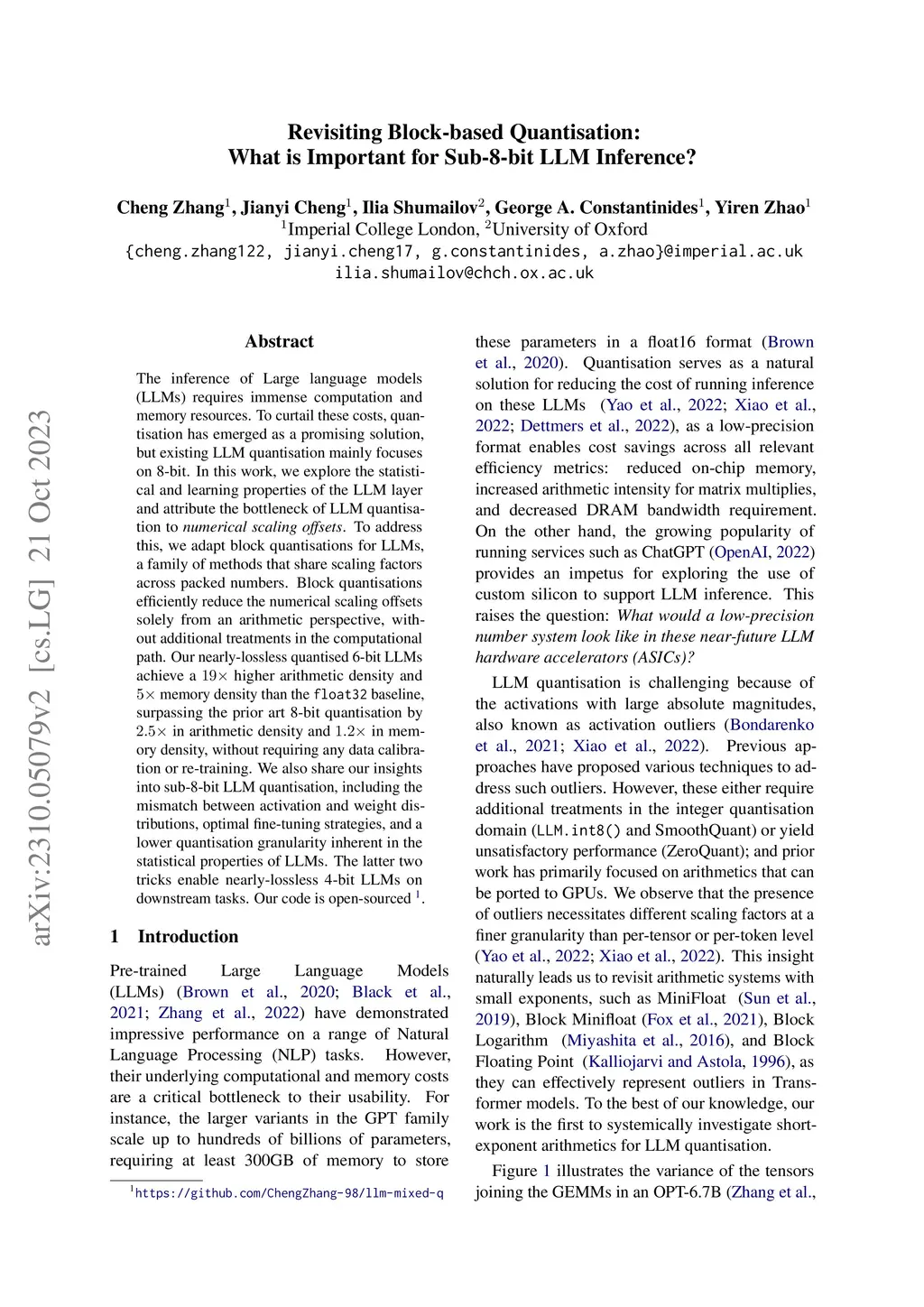 The inference of Large language models (LLMs) requires immense computation and memory resources. To curtail these costs, quantisation has merged as a promising solution, but existing LLM quantisation mainly focuses on 8-bit. In this work, we explore the statistical and learning properties of the LLM layer and attribute the bottleneck of LLM quantisation to numerical scaling offsets. To address this, we adapt block quantisations for LLMs, a family of methods that share scaling factors across packed numbers. Block quantisations efficiently reduce the numerical scaling offsets solely from an arithmetic perspective, without additional treatments in the computational path. Our nearly-lossless quantised 6-bit LLMs achieve a higher arithmetic density and memory density than the float32 baseline, surpassing the prior art 8-bit quantisation by in arithmetic density and in memory density, without requiring any data calibration or re-training. We also share our insights into sub-8-bit LLM quantisation, including the mismatch between activation and weight distributions, optimal fine-tuning strategies, and a lower quantisation granularity inherent in the statistical properties of LLMs. The latter two tricks enable nearly-lossless 4-bit LLMs on downstream tasks. Our code is open-sourced.