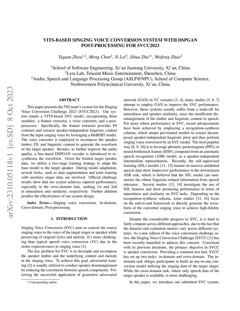 This paper presents the T02 team's system for the Singing Voice Conversion Challenge 2023 (SVCC2023). Our system entails a VITS-based SVC model, incorporating three modules: a feature extractor, a voice converter, and a post-processor. Specifically, the feature extractor provides F0 contours and extracts speaker-independent linguistic content from the input singing voice by leveraging a HuBERT model. The voice converter is employed to recompose the speaker timbre, F0, and linguistic content to generate the waveform of the target speaker. Besides, to further improve the audio quality, a fine-tuned DSPGAN vocoder is introduced to re-synthesise the waveform. Given the limited target speaker data, we utilize a two-stage training strategy to adapt the base model to the target speaker. During model adaptation, several tricks, such as data augmentation and joint training with auxiliary singer data, are involved. Official challenge results show that our system achieves superior performance, especially in the cross-domain task, ranking 1st and 2nd in naturalness and similarity, respectively. Further ablation justifies the effectiveness of our system design.