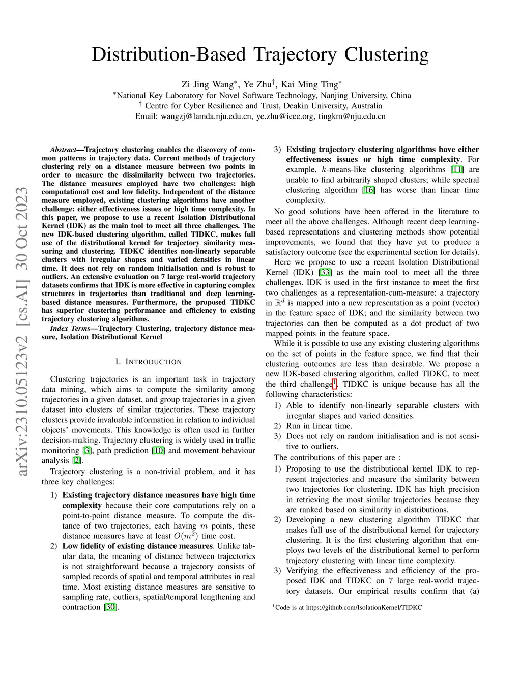 Trajectory clustering enables the discovery of common patterns in trajectory data. Current methods of trajectory clustering rely on a distance measure between two points in order to measure the dissimilarity between two trajectories. The distance measures employed have two challenges: high computational cost and low fidelity. Independent of the distance measure employed, existing clustering algorithms have another challenge: either effectiveness issues or high time complexity. In this paper, we propose to use a recent Isolation Distributional Kernel (IDK) as the main tool to meet all three challenges. The new IDK-based clustering algorithm, called TIDKC, makes full use of the distributional kernel for trajectory similarity measuring and clustering. TIDKC identifies non-linearly separable clusters with irregular shapes and varied densities in linear time. It does not rely on random initialisation and is robust to outliers. An extensive evaluation on 7 large real-world trajectory datasets confirms that IDK is more effective in capturing complex structures in trajectories than traditional and deep learning-based distance measures. Furthermore, the proposed TIDKC has superior clustering performance and efficiency to existing trajectory clustering algorithms.