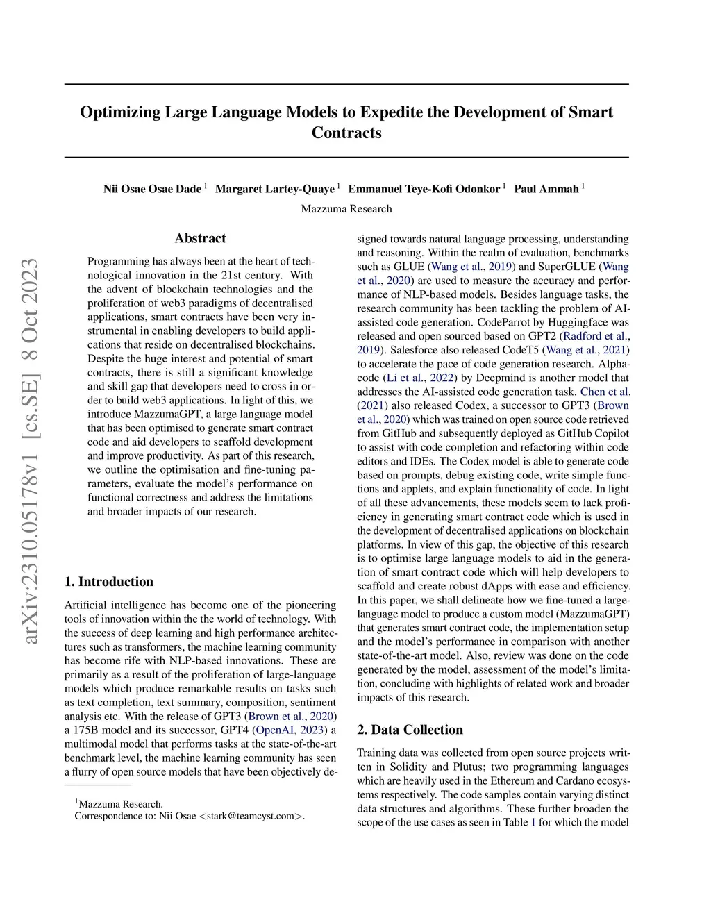 Programming has always been at the heart of technological innovation in the 21st century. With the advent of blockchain technologies and the proliferation of web3 paradigms of decentralised applications, smart contracts have been very instrumental in enabling developers to build applications that reside on decentralised blockchains. Despite the huge interest and potential of smart contracts, there is still a significant knowledge and skill gap that developers need to cross in order to build web3 applications. In light of this, we introduce MazzumaGPT, a large language model that has been optimised to generate smart contract code and aid developers to scaffold development and improve productivity. As part of this research, we outline the optimisation and fine-tuning parameters, evaluate the model's performance on functional correctness and address the limitations and broader impacts of our research.