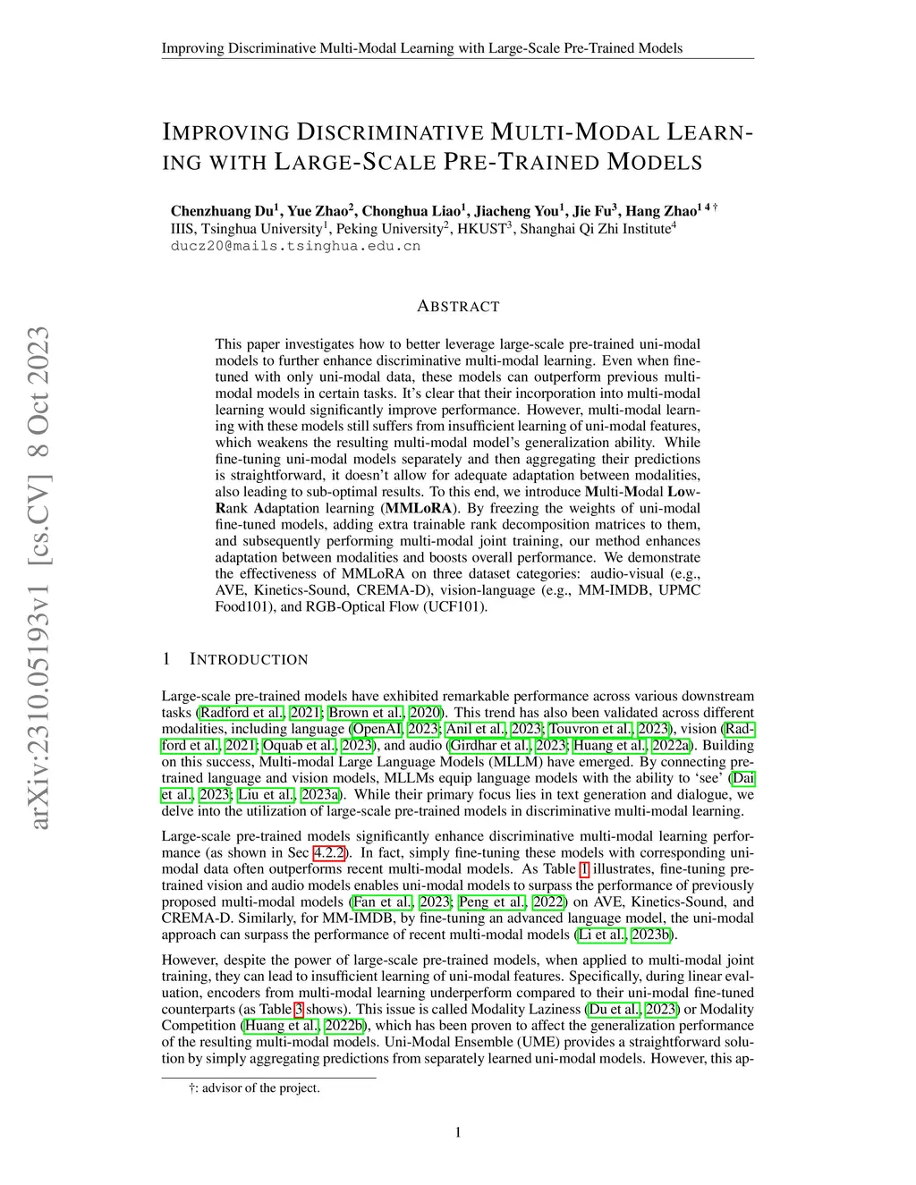 This paper investigates how to better leverage large-scale pre-trained uni-modal models to further enhance discriminative multi-modal learning. Even when fine-tuned with only uni-modal data, these models can outperform previous multi-modal models in certain tasks. It's clear that their incorporation into multi-modal learning would significantly improve performance. However, multi-modal learning with these models still suffers from insufficient learning of uni-modal features, which weakens the resulting multi-modal model's generalization ability. While fine-tuning uni-modal models separately and then aggregating their predictions is straightforward, it doesn't allow for adequate adaptation between modalities, also leading to sub-optimal results. To this end, we introduce Multi-Modal Low-Rank Adaptation learning (MMLoRA). By freezing the weights of uni-modal fine-tuned models, adding extra trainable rank decomposition matrices to them, and subsequently performing multi-modal joint training, our method enhances adaptation between modalities and boosts overall performance. We demonstrate the effectiveness of MMLoRA on three dataset categories: audio-visual (e.g., AVE, Kinetics-Sound, CREMA-D), vision-language (e.g., MM-IMDB, UPMC Food101), and RGB-Optical Flow (UCF101).