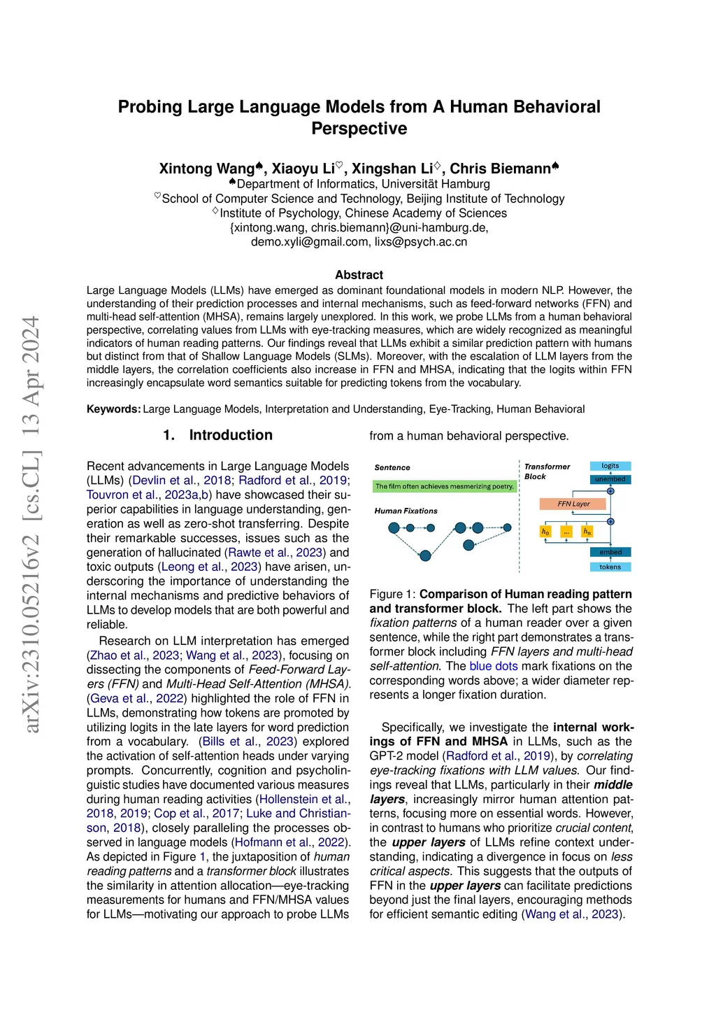 Large Language Models (LLMs) have emerged as dominant foundational models in modern NLP. However, the understanding of their prediction processes and internal mechanisms, such as feed-forward networks (FFN) and multi-head self-attention (MHSA), remains largely unexplored. In this work, we probe LLMs from a human behavioral perspective, correlating values from LLMs with eye-tracking measures, which are widely recognized as meaningful indicators of human reading patterns. Our findings reveal that LLMs exhibit a similar prediction pattern with humans but distinct from that of Shallow Language Models (SLMs). Moreover, with the escalation of LLM layers from the middle layers, the correlation coefficients also increase in FFN and MHSA, indicating that the logits within FFN increasingly encapsulate word semantics suitable for predicting tokens from the vocabulary.