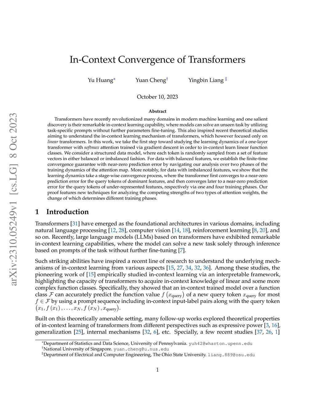 Transformers have recently revolutionized many domains in modern machine learning and one salient discovery is their remarkable in-context learning capability, where models can solve an unseen task by utilizing task-specific prompts without further parameters fine-tuning. This also inspired recent theoretical studies aiming to understand the in-context learning mechanism of transformers, which however focused only on linear transformers. In this work, we take the first step toward studying the learning dynamics of a one-layer transformer with softmax attention trained via gradient descent in order to in-context learn linear function classes. We consider a structured data model, where each token is randomly sampled from a set of feature vectors in either balanced or imbalanced fashion. For data with balanced features, we establish the finite-time convergence guarantee with near-zero prediction error by navigating our analysis over two phases of the training dynamics of the attention map. More notably, for data with imbalanced features, we show that the learning dynamics take a stage-wise convergence process, where the transformer first converges to a near-zero prediction error for the query tokens of dominant features, and then converges later to a near-zero prediction error for the query tokens of under-represented features, respectively via one and four training phases. Our proof features new techniques for analyzing the competing strengths of two types of attention weights, the change of which determines different training phases.