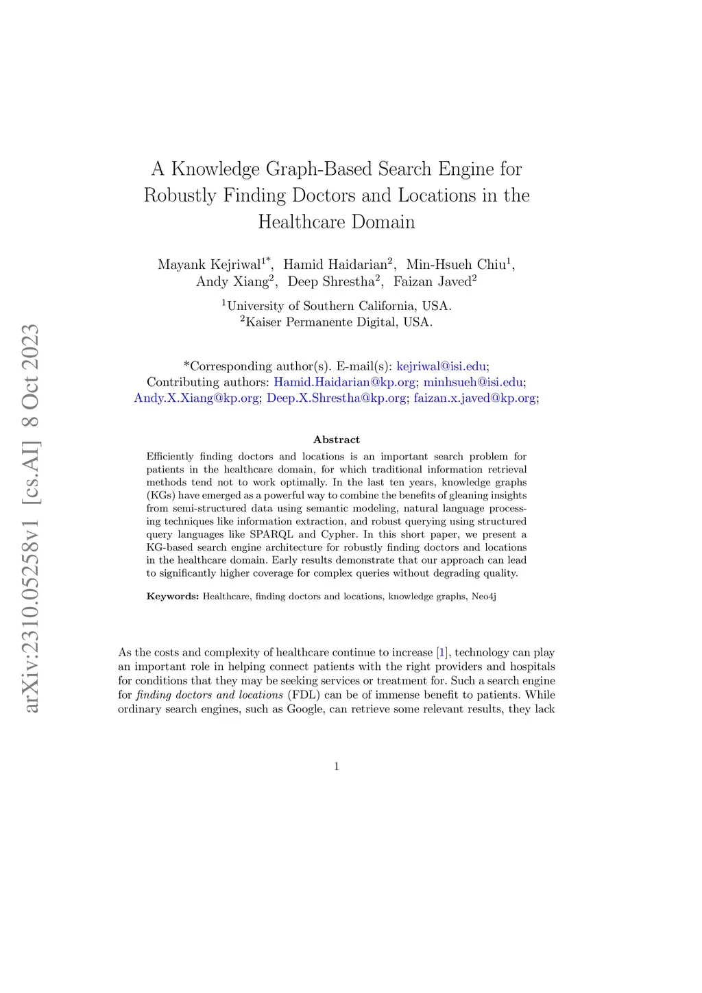 Efficiently finding doctors and locations is an important search problem for patients in the healthcare domain, for which traditional information retrieval methods tend not to work optimally. In the last ten years, knowledge graphs (KGs) have emerged as a powerful way to combine the benefits of gleaning insights from semi-structured data using semantic modeling, natural language processing techniques like information extraction, and robust querying using structured query languages like SPARQL and Cypher. In this short paper, we present a KG-based search engine architecture for robustly finding doctors and locations in the healthcare domain. Early results demonstrate that our approach can lead to significantly higher coverage for complex queries without degrading quality.