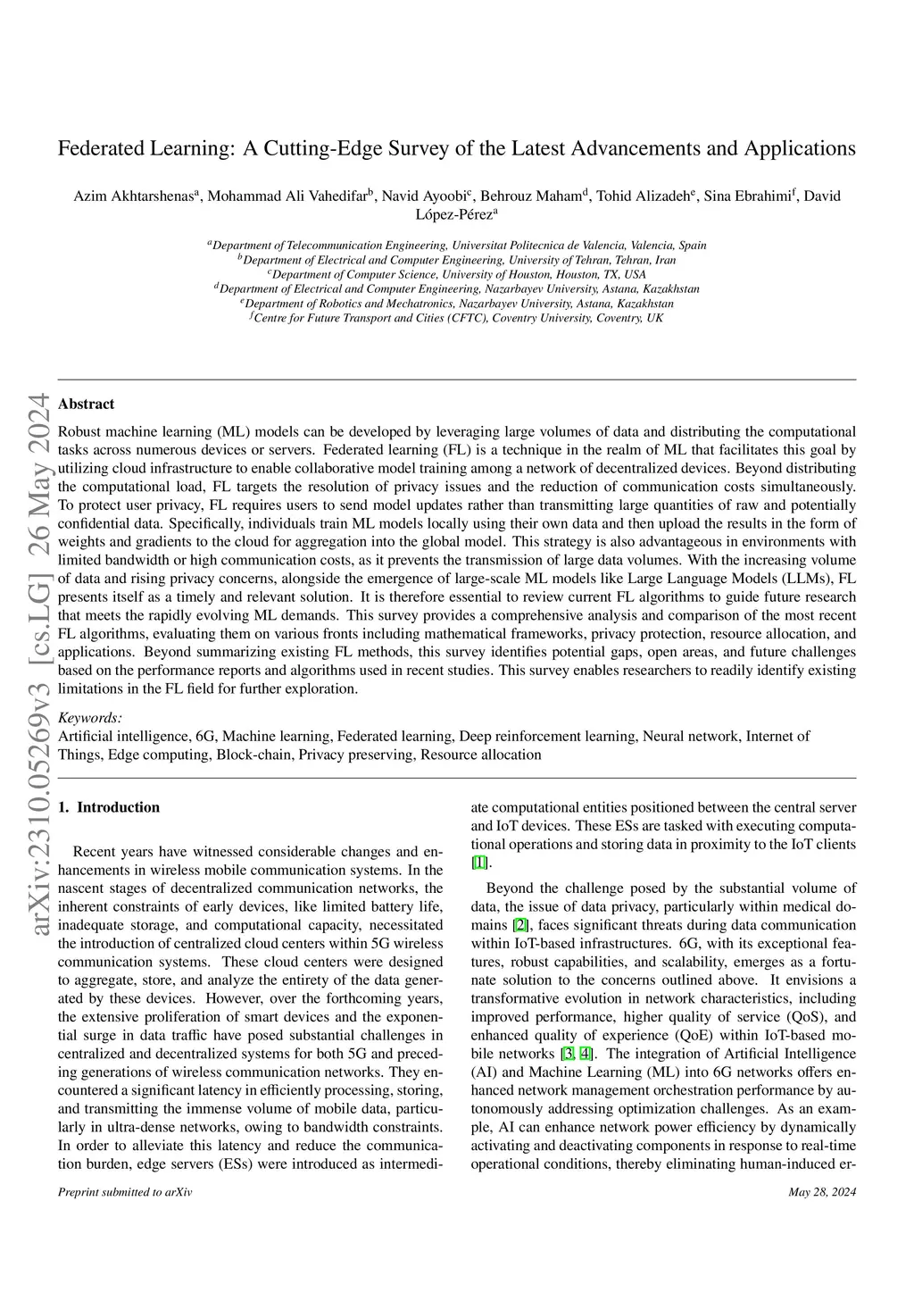 Robust machine learning (ML) models can be developed by leveraging large volumes of data and distributing the computational tasks across numerous devices or servers. Federated learning (FL) is a technique in the realm of ML that facilitates this goal by utilizing cloud infrastructure to enable collaborative model training among a network of decentralized devices. Beyond distributing the computational load, FL targets the resolution of privacy issues and the reduction of communication costs simultaneously. To protect user privacy, FL requires users to send model updates rather than transmitting large quantities of raw and potentially confidential data. Specifically, individuals train ML models locally using their own data and then upload the results in the form of weights and gradients to the cloud for aggregation into the global model. This strategy is also advantageous in environments with limited bandwidth or high communication costs, as it prevents the transmission of large data volumes. With the increasing volume of data and rising privacy concerns, alongside the emergence of large-scale ML models like Large Language Models (LLMs), FL presents itself as a timely and relevant solution. It is therefore essential to review current FL algorithms to guide future research that meets the rapidly evolving ML demands. This survey provides a comprehensive analysis and comparison of the most recent FL algorithms, evaluating them on various fronts including mathematical frameworks, privacy protection, resource allocation, and applications. Beyond summarizing existing FL methods, this survey identifies potential gaps, open areas, and future challenges based on the performance reports and algorithms used in recent studies. This survey enables researchers to readily identify existing limitations in the FL field for further exploration.