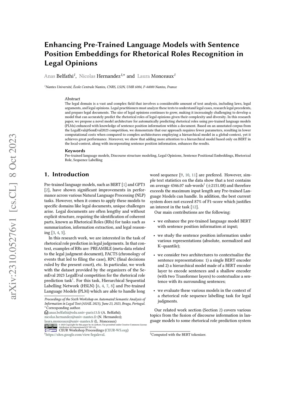 The legal domain is a vast and complex field that involves a considerable amount of text analysis, including laws, legal arguments, and legal opinions. Legal practitioners must analyze these texts to understand legal cases, research legal precedents, and prepare legal documents. The size of legal opinions continues to grow, making it increasingly challenging to develop a model that can accurately predict the rhetorical roles of legal opinions given their complexity and diversity. In this research paper, we propose a novel model architecture for automatically predicting rhetorical roles using pre-trained language models (PLMs) enhanced with knowledge of sentence position information within a document. Based on an annotated corpus from the LegalEval@SemEval2023 competition, we demonstrate that our approach requires fewer parameters, resulting in lower computational costs when compared to complex architectures employing a hierarchical model in a global-context, yet it achieves great performance. Moreover, we show that adding more attention to a hierarchical model based only on BERT in the local-context, along with incorporating sentence position information, enhances the results.